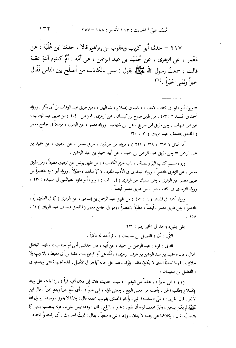 217 - حَدَّثَنَا أَبُو كُرَيْبٍ، وَيَعْقُوبُ بْنُ إِبْرَاهِيمَ، قَالَا: حَدَّثَنَا ابْنُ عُلَيَّةَ، عَنْ مَعْمَرٍ، عَنِ الزُّهْرِيِّ، عَنْ حُمَيْدِ بْنِ عَبْدِ الرَّحْمَنِ، عَنْ أُمِّهِ أُمِّ كُلْثُومِ ابْنَةِ عُقْبَةَ، قَالَتْ: سَمِعْتُ رَسُولَ اللَّهِ صَلَّى اللهُ عَلَيْهِ وَسَلَّمَ يَقُولُ: «§لَيْسَ بِالْكَاذِبِ مَنْ أَصْلَحَ بَيْنَ النَّاسِ فَقَالَ خَيْرًا، وَنَمَى خَيْرًا»