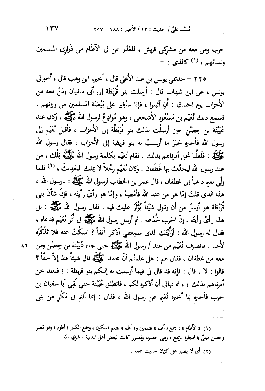 225 - حَدَّثَنِي يُونُسُ بْنُ عَبْدِ الْأَعْلَى، قَالَ: أَخْبَرَنَا ابْنُ وَهْبٍ، قَالَ: أَخْبَرَنِي يُونُسُ، عَنِ ابْنِ شِهَابٍ، قَالَ: أَرْسَلتْ بَنُو قُرَيْظَةَ إِلَى أَبِي سُفْيَانَ وَمَنْ مَعَهُ مِنَ الْأَحْزَابِ يَوْمَ الْخَنْدَقِ: أَنِ اثْبُتُوا، فَإِنَّا سَنُغِيرُ عَلَى بَيْضَةِ الْمُسْلِمِينَ مِنْ وَرَائِهِمْ. فَسَمِعَ ذَلِكَ نُعَيْمُ بْنُ مَسْعُودٍ الْأَشْجَعِيُّ، وَهُوَ مُوَادِعٌ لِرَسُولِ اللَّهِ صَلَّى اللهُ عَلَيْهِ وَسَلَّمَ، وَكَانَ عِنْدَ عُيَيْنَةَ بْنِ حِصْنٍ حِينَ أَرْسَلَتْ بِذَلِكَ بَنُو قُرَيْظَةَ إِلَى الْأَحْزَابِ، فَأَقْبَلَ نُعَيْمٌ إِلَى رَسُولِ اللَّهِ فَأَخْبَرَهُ خَبَرَ مَا أَرْسَلَتْ بِهِ بَنُو قُرَيْظَةَ إِلَى الْأَحْزَابِ، فَقَالَ رَسُولُ اللَّهِ صَلَّى اللهُ عَلَيْهِ وَسَلَّمَ: «فَلَعَلَّنَا نَحْنُ أَمَرْنَاهُمْ بِذَلِكَ» ، فَقَامَ نُعَيْمٌ بِكَلِمَةِ رَسُولِ اللَّهِ صَلَّى اللهُ عَلَيْهِ وَسَلَّمَ تِلْكَ مِنْ عِنْدِ رَسُولِ اللَّهِ لَيُحَدِّثَ بِهَا غَطَفَانَ، وَكَانَ نُعَيْمٌ رَجُلًا لَا يَمْلِكُ الْحَدِيثَ فَلَمَّا وَلَّى نُعَيْمٌ ذَاهِبًا إِلَى غَطَفَانَ , قَالَ عُمَرُ بْنُ الْخَطَّابِ: لِرَسُولِ اللَّهِ صَلَّى اللهُ عَلَيْهِ وَسَلَّمَ: يَا رَسُولَ اللَّهِ، هَذَا الَّذِي قُلْتَ إِمَّا هُوَ مِنْ عِنْدِ اللَّهِ فَأَمْضِهِ، وَإِمَّا هُوَ رَأْيٌ رَأَيْتَهُ، فَإِنَّ شَأْنَ بَنِي قُرَيْظَةَ هُوَ أَيْسَرُ مِنْ أَنْ يَقُولَ شَيْئًا يُؤْثَرُ عَلَيْكَ فِيهِ. فَقَالَ رَسُولُ اللَّهِ صَلَّى اللهُ عَلَيْهِ وَسَلَّمَ: «§بَلْ هَذَا رَأْيٌ رَأَيْتُهُ، إِنَّ الْحَرْبَ خُدْعَةٌ» . ثُمَّ أَرْسَلَ رَسُولُ اللَّهِ صَلَّى اللهُ عَلَيْهِ وَسَلَّمَ فِي إِثْرِ نُعَيْمٍ فَدَعَاهُ، فَقَالَ لَهُ رَسُولُ اللَّهِ: «أَرَأَيْتَكَ الَّذِي سَمِعْتَنِي أَذْكُرُ آنِفًا؟ اسْكُتْ عَنْهُ فَلَا تَذْكُرْهُ لِأَحَدٍ» . فَانْصَرَفَ نُعَيْمٌ مِنْ عِنْدِ رَسُولِ اللَّهِ صَلَّى اللهُ عَلَيْهِ وَسَلَّمَ حَتَّى جَاءَ عُيَيْنَةَ بْنَ حِصْنٍ وَمَنْ مَعَهُ مِنْ غَطَفَانَ، فَقَالَ لَهُمْ: هَلْ عَلِمْتُمْ أَنَّ مُحَمَّدًا صَلَّى اللهُ عَلَيْهِ وَسَلَّمَ قَالَ: شَيْئًا قَطُّ إِلَّا حَقًّا؟ قَالُوا: لَا، قَالَ: فَإِنَّهُ قَدْ قَالَ لِي فِيمَا أَرْسَلَتْ بِهِ إِلَيْكُمْ بَنُو قُرَيْظَةَ: «فَلَعَلَّنَا نَحْنُ أَمَرْنَاهُمْ بِذَلِكَ» ، ثُمَّ نَهَانِي أَنْ أَذْكُرَهُ لَكُمْ، فَانْطَلَقَ عُيَيْنَةُ حَتَّى لَقِيَ أَبَا سُفْيَانَ بْنَ حَرْبٍ , فَأَخْبَرَهُ بِمَا أَخْبَرَهُ نُعَيْمٌ عَنْ رَسُولِ اللَّهِ، فَقَالَ: إِنَّمَا أَنْتُمْ فِي مَكْرٍ مِنْ بَنِي -[138]- قُرَيْظَةَ. قَالَ أَبُو سُفْيَانَ: فَنُرْسِلُ إِلَيْهِمْ نَسْأَلُهُمُ الرَّهْنَ، فَإِنْ دَفَعُوا إِلَيْنَا رَهْنًا مِنْهُمْ فَصَدِّقُوا، وَإِنْ أَبَوْا فَنَحْنُ مِنْهُمْ فِي مَكْرٍ. فَجَاءَهُمْ رَسُولُ أَبِي سُفْيَانَ يَسْأَلُهُمُ الرَّهْنَ , فَقَالَ: إِنَّكُمْ أَرْسَلْتُمْ إِلَيْنَا تَأْمُرُونَ بِالْمُكْثِ , وَتَزْعُمُونَ أَنَّكُمْ سَتُخَالِفُونَ مُحَمَّدًا، وَمَنْ مَعَهُ، فَإِنْ كُنْتُمْ صَادِقِينَ فَأَرْهِنُونَا بِذَلِكَ مِنْ أَبْنَائِكُمْ، وَصَبِّحُوهُمْ غَدًا. قَالَتْ بَنُو قُرَيْظَةَ: قَدْ دَخَلَتْ عَلَيْنَا لَيْلَةُ السَّبْتِ، وَلَسْنَا نَقْضِي فِي لَيْلَةِ السَّبْتِ وَلَا فِي يَوْمِهَا أَمْرًا، فَأَمْهِلُوا حَتَّى يَذْهَبَ السَّبْتُ. فَرَجَعَ الرَّسُولُ إِلَى أَبِي سُفْيَانَ بِذَلِكَ، فَقَالَ أَبُو سُفْيَانَ: وَرُءُوسُ الْأَحْزَابِ مَعَهُ: هَذَا مَكْرٌ مِنْ بَنِي قُرَيْظَةَ، فَارْتَحِلُوا. فَبَعَثَ اللَّهُ تَبَارَكَ وَتَعَالَى عَلَيْهِمُ الرِّيحَ حَتَّى مَا كَادَ رَجُلٌ مِنْهُمْ يَهِدِّي إِلَى رَحْلِهِ، فَكَانَتْ تِل