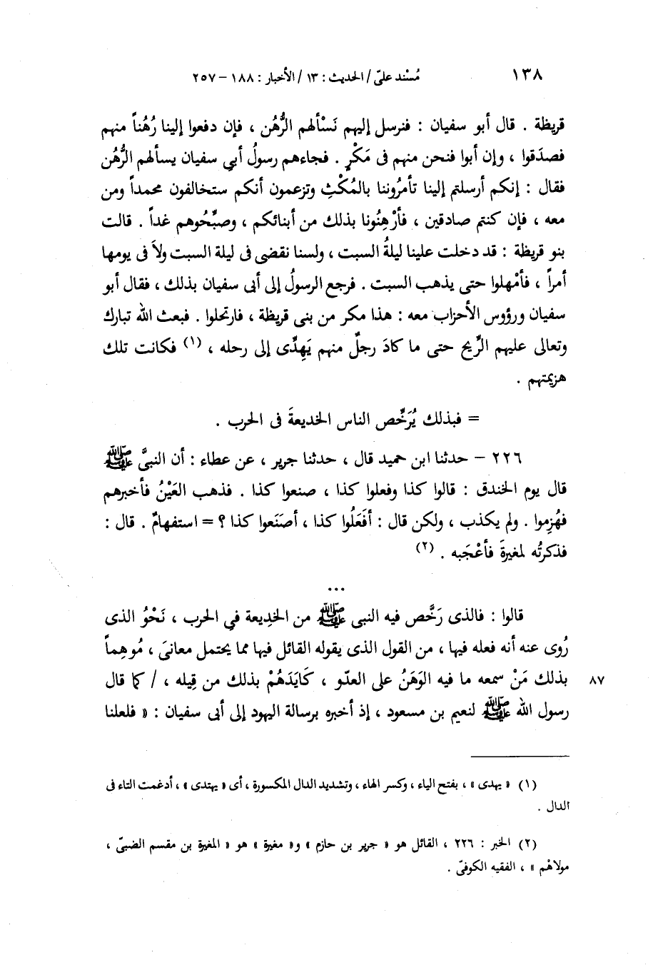 226 - حَدَّثَنَا ابْنُ حُمَيْدٍ، قَالَ: حَدَّثَنَا جَرِيرٌ، عَنْ عَطَاءٍ، أَنَّ النَّبِيَّ صَلَّى اللهُ عَلَيْهِ وَسَلَّمَ قَالَ يَوْمَ الْخَنْدَقِ: «§قَالُوا كَذَا، وَفَعَلُوا كَذَا، صَنَعُوا كَذَا» فَذَهَبَ الْعَيْنُ فَأَخْبَرَهُمْ، فَهُزِمُوا، وَلَمْ يَكْذِبْ، وَلَكِنْ قَالَ: أَفَعَلُوا كَذَا، أَصَنَعُوا كَذَا؟ اسْتِفْهَامٌ. قَالَ: فَذَكَرْتُهُ لِمُغِيرَةَ فَأَعْجَبَهُ " قَالُوا: فَالَّذِي رَخَّصَ فِيهِ النَّبِيُّ صَلَّى اللهُ عَلَيْهِ وَسَلَّمَ مِنَ الْخَدِيعَةِ فِي الْحَرْبِ، نَحْوُ الَّذِي رُوِيَ عَنْهُ أَنَّهُ فَعَلَهُ فِيهَا مِنَ الْقَوْلِ الَّذِي يَقُولُ الْقَائِلُ فِيهَا مِمَّا يَحْتَمِلُ مَعَانِيَ، مُوهِمًا بِذَلِكَ مَنْ سَمِعَهُ مَا فِيهِ الْوَهَنُ عَلَى الْعَدُوِّ، كَايَدَهُمْ بِذَلِكَ مِنْ قِيلِهِ، كَمَا قَالَ رَسُولُ اللَّهِ صَلَّى اللهُ عَلَيْهِ وَسَلَّمَ لِنُعَيْمِ بْنِ مَسْعُودٍ إِذْ أَخْبَرَهُ بِرِسَالَةِ الْيَهُودِ إِلَى أَبِي سُفْيَانَ: «فَلَعَلَّنَا -[139]- نَحْنُ أَمَرْنَاهُمْ بِذَلِكَ» ، فَقَالَ قَوْلًا مُحْتَمِلًا ظَاهِرُهُ أَنْ يَكُونَ مَعْنَاهُ أَنَّ الْيَهُودَ فَعَلُوا مَا فَعَلُوا، مِنْ إِرْسَالِهِمُ الرُّسُلَ فِيهِ إِلَى أَبِي سُفْيَانَ بِمَا أَرْسَلُوا بِهِ، إِمَّا عَنْ أَمْرِهِ، أَوْ عَنْ غَيْرِ أَمْرِهِ. وَذَلِكَ، لَا شَكَّ، أَنَّهُ كَمَا قَالَ صَلَّى اللهُ عَلَيْهِ وَسَلَّمَ مِنْ أَنَّ الْقَوْمَ لَمْ يَفْعَلُوا إِلَّا عَنْ أَحَدِ ذَيْنِكَ الْوَجْهَيْنِ، إِمَّا عَنْ أَمْرِهِ، وَإِمَّا عَنْ غَيْرِ أَمْرِهِ , وَذَلِكَ هُوَ الصِّدْقُ الَّذِي لَا مِرْيَةَ فِيهِ. وَإِنَّمَا كَانَ يَكُونُ ذَلِكَ كَذِبًا لَوْ قَالَ: «إِنَّمَا أَرْسَلَتِ الْيَهُودُ إِلَى أَبِي سُفْيَانَ بِمَا أَرْسَلَتْ بِهِ إِلَيْهِ، بِأَمْرِنَا إِيَّاهُمْ بِذَلِكَ» ، فَأَمَّا قَوْلُهُ: «فَلَعَلَّنَا نَحْنُ أَمَرْنَاهُمْ بِذَلِكَ» ، فَمِنَ الْكَذِبِ بِمَعْزِلٍ قَالُوا: وَمِنَ الْخَدِيعَةِ الَّتِي أَذِنَ صَلَّى اللهُ عَلَيْهِ وَسَلَّمَ فِيهَا فِي الْحَرْبِ مَا رُوِيَ عَنْ كَعْبِ بْنِ مَالِكٍ أَنَّهُ كَانَ إِذَا أَرَادَ غَزْوَ قَوْمٍ وَرَّى بِغَيْرِهِمْ. قَالُوا: وَكَالَّذِي رُوِيَ عَنْهُ صَلَّى اللهُ عَلَيْهِ وَسَلَّمَ فِي ذَلِكَ، كَانَ يَفْعَلُ أَهْلُ الدِّينِ وَالْفَضْلِ فِي مَغَازِيهِمْ، قَالُوا: وَمِنْ ذَلِكَ مَا