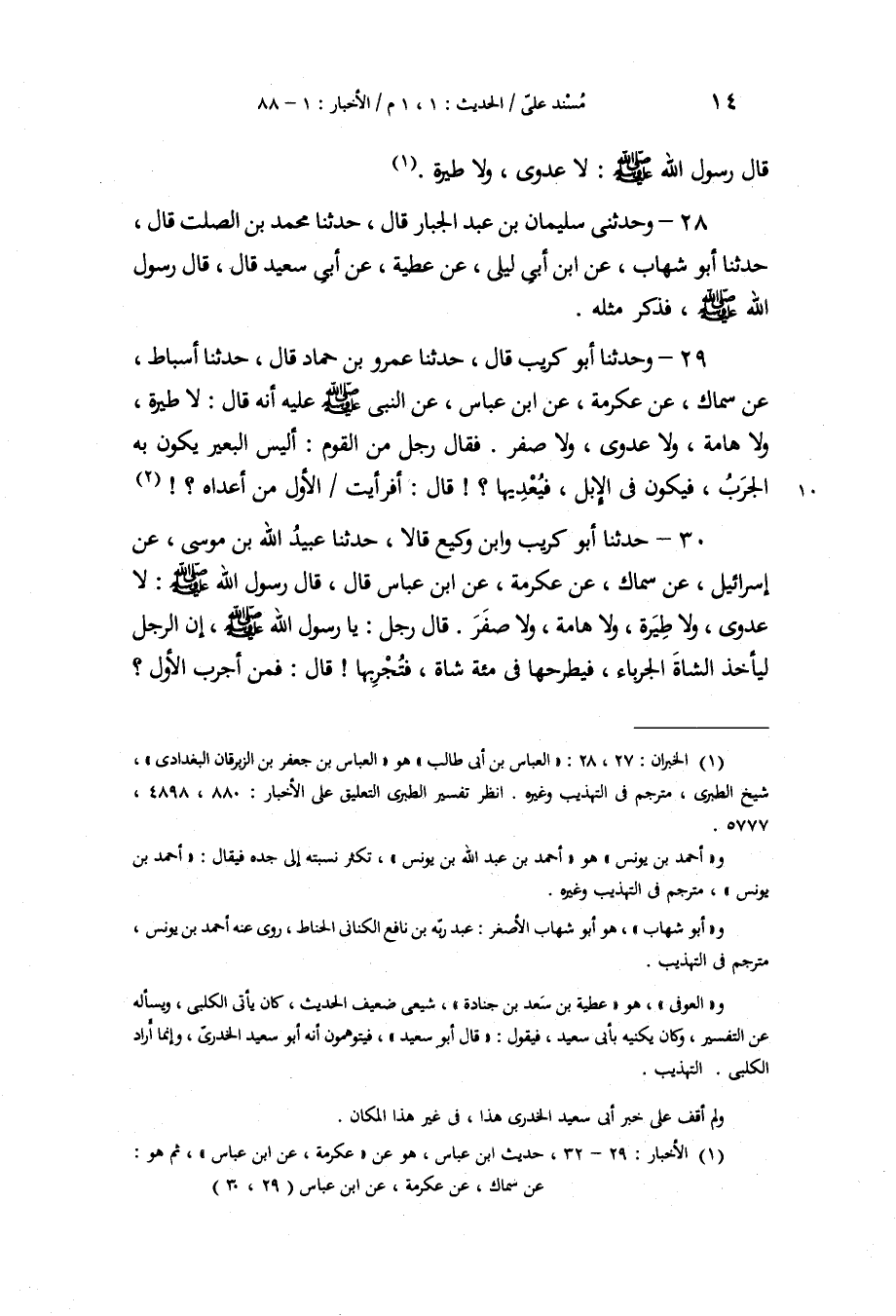 29 - وَحَدَّثَنَا أَبُو كُرَيْبٍ، قَالَ: حَدَّثَنَا عَمْرُو بْنُ حَمَّادٍ، قَالَ: حَدَّثَنَا أَسْبَاطٌ، عَنْ سِمَاكٍ، عَنْ عِكْرِمَةَ، عَنِ ابْنِ عَبَّاسٍ، عنِ النَّبِيِّ صَلَّى اللهُ عَلَيْهِ وَسَلَّمَ أَنَّهُ قَالَ: «§لَا طِيَرَةَ، وَلَا هَامَةَ، وَلَا عَدْوَى، وَلَا صَفَرَ» فَقَالَ رَجُلٌ مِنَ الْقَوْمِ: «أَلَيْسَ الْبَعِيرُ يَكُونُ بِهِ الْجَرَبُ، فَيَكُونُ فِي الْإِبِلِ، فَيُعْدِيَهَا؟» قَالَ: «أَفَرَأَيْتَ الْأَوَّلَ؟ مَنْ أَعْدَاهُ؟»