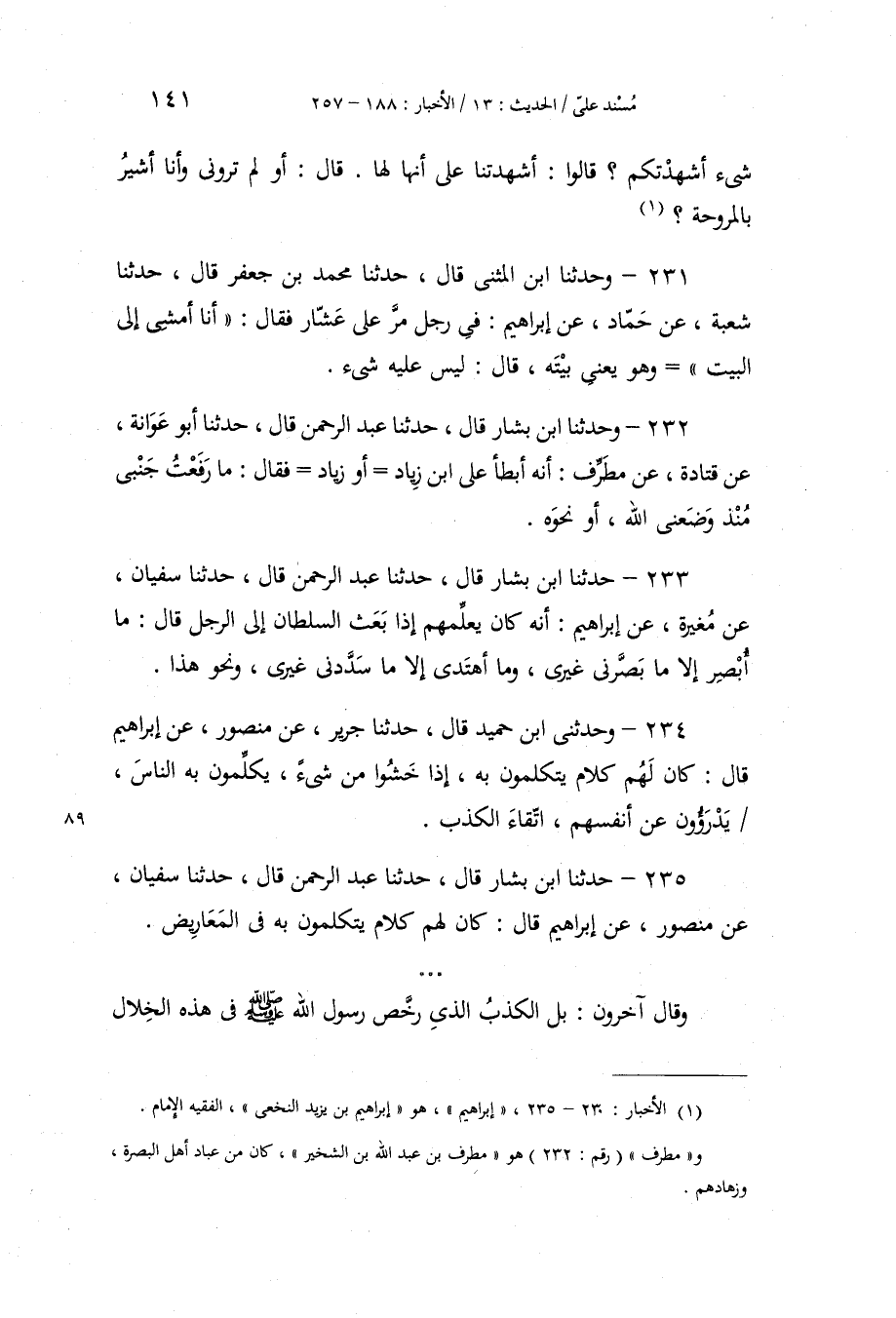 235 - حَدَّثَنَا ابْنُ بَشَّارٍ، قَالَ: حَدَّثَنَا عَبْدُ الرَّحْمَنِ، قَالَ: حَدَّثَنَا سُفْيَانُ، عَنْ مَنْصُورٍ، عَنْ إِبْرَاهِيمَ، قَالَ: «§كَانَ لَهُمْ كَلَامٌ يَتَكَلَّمُونَ بِهِ فِي الْمَعَارِيضِ» وَقَالَ آخَرُونَ: بَلِ الْكَذِبُ الَّذِي رَخَّصَ رَسُولُ اللَّهِ صَلَّى اللهُ عَلَيْهِ وَسَلَّمَ فِي هَذِهِ الْخِلَالِ -[142]- الثَّلَاثِ، هُوَ جَمِيعُ مَعَانِي الْكَذِبِ