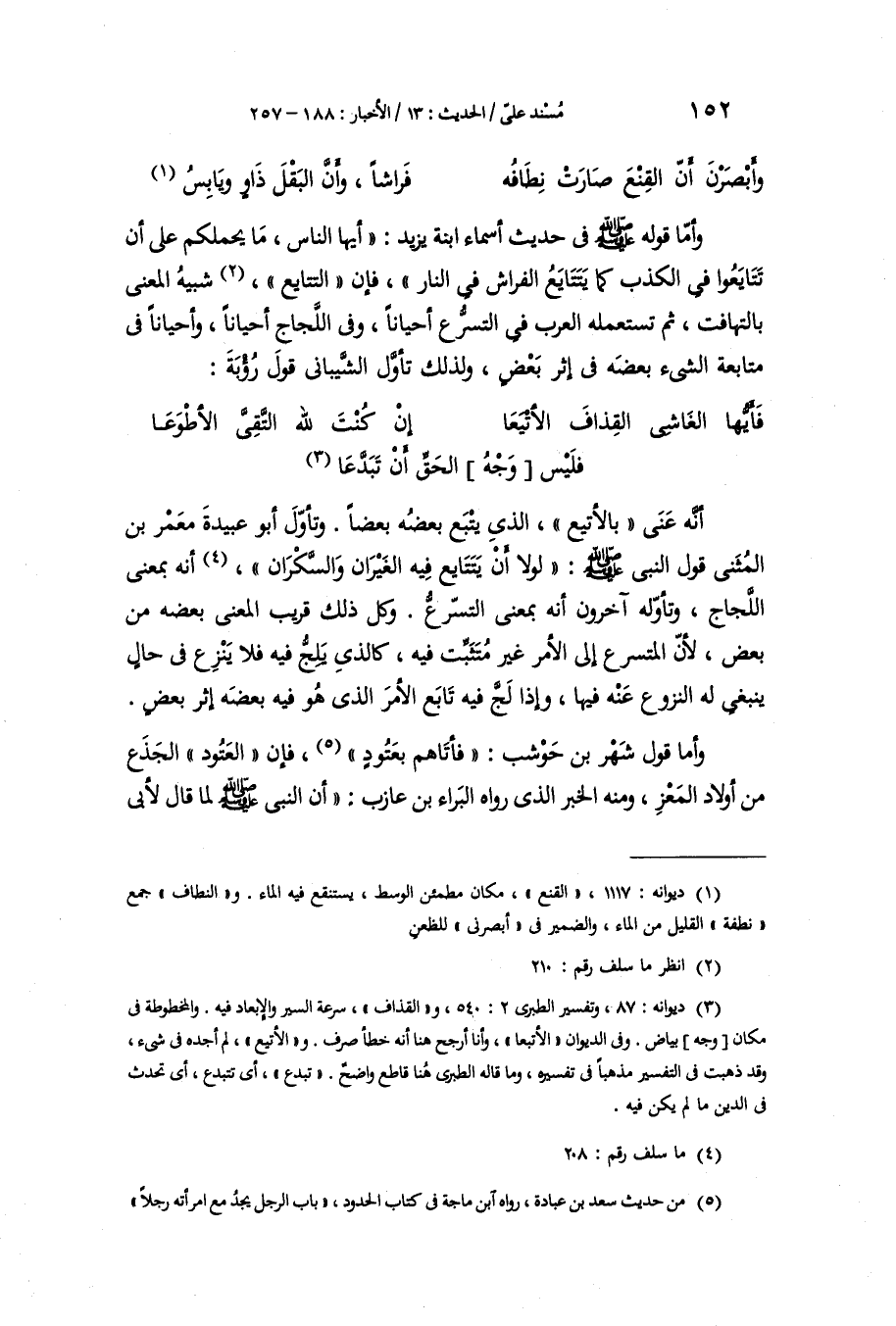 أَنَّهُ عَنَى بِالْأَتْيَعِ الَّذِي يَتْبَعُ بَعْضُهُ بَعْضًا، وَتَأَوَّلَ أَبُو عُبَيْدَةَ مَعْمَرُ بْنُ الْمُثَنَّى قَوْلَ النَّبِيِّ صَلَّى اللهُ عَلَيْهِ وَسَلَّمَ: «لَوْلَا أَنْ يَتَتَايَعَ فِيهِ الْغَيْرَانُ وَالسَّكْرَانُ» ، أَنَّهُ بِمَعْنَى اللَّجَاجِ، وَتَأَوَّلَهُ آخَرُونَ أَنَّهُ بِمَعْنَى التَّسَرُّعِ. وَكُلُّ ذَلِكَ قَرِيبُ الْمَعْنَى، بَعْضُهُ مِنْ بَعْضٍ، لِأَنَّ الْمُتَسَرِّعَ إِلَى الْأَمْرِ غَيْرُ مُتَثَبِّتٍ فِيهِ، كَالَّذِي يَلِجُّ فِيهِ فَلَا يَنْزِعُ فِي حَالٍ يَنْبَغِي لَهُ النُّزُوعُ عَنْهُ فِيهَا، وَإِذَا لَجَّ فِيهِ تَابَعَ الْأَمْرَ الَّذِي هُوَ فِيهِ بَعْضَهُ إِثْرَ بَعْضٍ. وَأَمَّا قَوْلُ شَهْرِ بْنِ حَوْشَبٍ: فَأَتَاهُمْ بِعَتُودٍ، فَإِنَّ الْعَتُودَ الْجَذَعُ مِنْ أَوْلَادِ الْمَعْزِ، وَمِنْهُ الْخَبَرُ الَّذِي رَوَاهُ الْبَرَاءُ بْنُ عَازِبٍ أَنَّ النَّبِيَّ صَلَّى اللهُ عَلَيْهِ وَسَلَّمَ لَمَّا قَالَ لِأَبِي