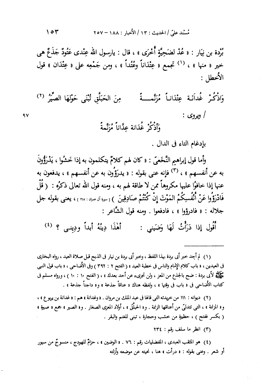 بُرْدَةَ بْنِ نِيَارٍ: «عُدْ لِضَحِيَّةٍ أُخْرَى» , قَالَ: يَا رَسُولَ اللَّهِ عِنْدِي عَتُودٌ جَذَعٌ هِيَ خَيْرٌ مِنْهَا، تُجْمَعُ عِتْدَانًا، وَعُتُدًا، وَمِنْ جَمْعِهِ عَلَى عِتْدَانَ قَوْلُ الْأَخْطَلِ: