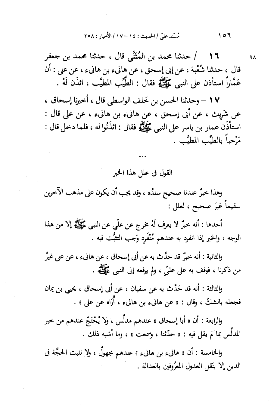 §الْقَوْلُ فِي عِلَلِ هَذَا الْخَبَرِ وَهَذَا خَبَرٌ عِنْدَنَا صَحِيحٌ سَنَدُهُ، وَقَدْ يَجِبُ أَنْ يَكُونَ عَلَى مَذْهَبِ الْآخَرِينَ سَقِيمًا غَيْرَ صَحِيحٍ، لِعِلَلٍ: أَحَدُهَا: أَنَّهُ خَبَرٌ لَا يُعْرَفُ لَهُ مَخْرَجٌ عَنْ عَلِيٍّ , عَنِ النَّبِيِّ صَلَّى اللهُ عَلَيْهِ وَسَلَّمَ إِلَّا مِنْ هَذَا الْوَجْهِ، وَالْخَبَرُ إِذَا انْفَردَ بِهِ عِنْدَهُمْ مُنْفَرِدٌ وَجَبَ التَّثَبُّتُ فِيهِ. وَالثَّانِيَةُ: أَنَّهُ خَبَرٌ قَدْ حَدَّثَ بِهِ عَنْ أَبِي إِسْحَاقَ، عَنْ هَانِئٍ، عَنْ عَلِيٍّ غَيْرَ مَنْ ذَكَرْنَا، فَوَقَفَ بِهِ عَلَى عَلِيٍّ، وَلَمْ يَرْفَعْهُ إِلَى النَّبِيِّ صَلَّى اللهُ عَلَيْهِ وَسَلَّمَ. وَالثَّالِثَةُ: أَنَّهُ قَدْ حَدَّثَ بِهِ عَنْ سُفْيَانَ، عَنْ أَبِي إِسْحَاقَ , يَحْيَى بْنُ يَمَانٍ فَجَعَلَهُ بِالشَّكِّ، وَقَالَ: عَنْ هَانِئِ بْنِ هَانِئٍ، أُرَاهُ عَنْ عَلِيٍّ. وَالرَّابِعَةُ: أَنَّ أَبَا إِسْحَاقَ عِنْدَهُمْ مُدَلِّسٌ، وَلَا يُحْتَجُّ عِنْدَهُمْ مِنْ خَبَرِ الْمُدَلِّسِ بِمَا لَمْ يَقُلْ فِيهِ: حَدَّثَنَا، وَسَمِعْتُ، وَمَا أَشْبَهَ ذَلِكَ. وَالْخَامِسَةُ أَنَّ هَانِئَ بْنَ هَانِئٍ عِنْدَهُمْ مَجْهُولٌ، وَلَا تَثْبُتُ الْحُجَّةُ فِي الدِّينِ إِلَّا بِنَقْلِ الْعُدُولِ الْمَعْرُوفِينَ بِالْعَدَالَةِ.