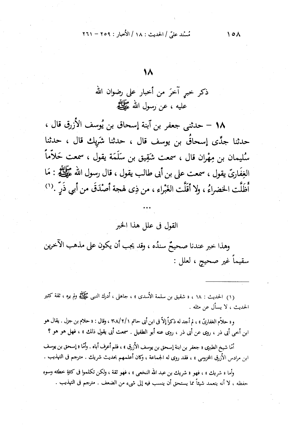 §الْقَوْلُ فِي عِلَلِ هَذَا الْخَبَرِ هَذَا الْخَبَرُ عِنْدَنَا صَحِيحٌ سَنَدُهُ، وَقَدْ يَجِبُ أَنْ يَكُونَ عَلَى مَذْهَبِ الْآخَرِينَ سَقِيمًا غَيْرَ صَحِيحٍ، لِعِلَلٍ -[159]-: إِحْدَاهَا: أَنَّهُ خَبَرٌ لَا يُعْرَفُ لَهُ عَنْ رَسُولِ اللَّهِ صَلَّى اللهُ عَلَيْهِ وَسَلَّمَ مَخْرَجٌ يَصِحُّ إِلَّا مِنْ هَذَا الْوَجْهِ، وَالْخَبَرُ إِذَا انْفَرَدَ بِهِ عِنْدَهُمْ مُنْفَرِدٌ وَجَبَ التَّثَبُّتُ فِيهِ. وَالثَّانِيَةُ: أَنَّ حَلَّامًا الْغِفَارِيَّ عِنْدَهُمْ مَجْهُولٌ غَيْرُ مَعْرُوفٍ فِي نَقَلَةِ الْآثَارِ، وَلَا يَجُوزُ الِاحْتِجَاجُ بِمَجْهُولٍ فِي الدِّينِ. وَالثَّالِثَةُ: أَنَّ شَرِيكًا عِنْدَهُمْ كَثِيرُ الْغَلَطِ، وَمَنْ كَانَ كَذَلِكَ كَانَ الْوَاجِبُ التَّوَقُّفُ فِي خَبَرِهِ. وَقَدْ وَافَقَ عَلِيًّا رَحْمَةُ اللَّهِ عَلَيْهِ فِي رِوَايَةِ هَذَا الْخَبَرِ عَنْ رَسُولِ اللَّهِ صَلَّى اللهُ عَلَيْهِ وَسَلَّمَ غَيْرُهُ مِنْ أَصْحَابِهِ , نَذْكُرُ مَا صَحَّ عِنْدَنَا سَنَدُهُ مِمَّا حَضَرَنَا ذِكْرُهُ مِنْ ذَلِكَ
