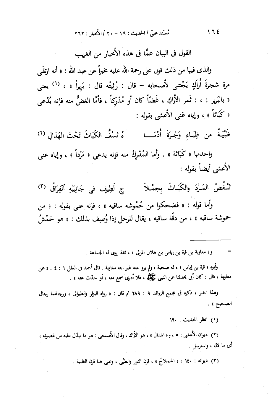 §الْقَوْلُ فِي الْبَيَانِ عَمَّا فِي هَذِهِ الْأَخْبَارِ مِنَ الْغَرِيبِ وَالَّذِي فِيهَا مِنْ قَوْلِ عَلِيٍّ رَحْمَةُ اللَّهِ عَلَيْهِ مُخْبِرًا عَنْ عَبْدِ اللَّهِ: أَنَّهُ ارْتَقَى مَرَّةً شَجَرَةَ أَرَاكٍ يَجْتَنِي لِأَصْحَابِهِ قَالَ: رُئِيتُهُ قَالَ: بَرِيرًا، يَعْنِي بِالْبَرِيرِ: ثَمَرَ الْأَرَاكِ، غَضًّا كَانَ أَوْ مُدْرِكًا، فَأَمَّا الْغَضُّ مِنْهُ فَإِنَّهُ يُدْعَى كَبَاثًا، وَإِيَّاهُ عَنَى الْأَعْشَى بِقَوْلِهِ: