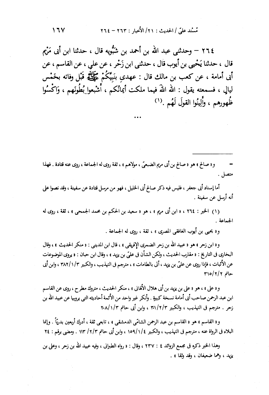 264 - وَحَدَّثَنِي عَبْدُ اللَّهِ بْنُ أَحْمَدَ بْنِ شَبُّوَيْهِ، قَالَ: حَدَّثَنَا ابْنُ أَبِي مَرْيَمَ، قَالَ: حَدَّثَنَا يَحْيَى بْنُ أَيُّوبَ، قَالَ: حَدَّثَنِي ابْنُ زَحْرٍ، عَنْ عَلِيٍّ، عَنِ الْقَاسِمِ، عَنْ أَبِي أُمَامَةَ، عَنْ كَعْبِ بْنِ مَالِكٍ، قَالَ: عَهْدِي بِنَبِيِّكُمْ صَلَّى اللهُ عَلَيْهِ وَسَلَّمَ قَبْلَ وَفَاتِهِ بِخَمْسِ لَيَالٍ، فَسَمِعْتُهُ يَقُولُ: «§اللَّهَ اللَّهَ فِيمَا مَلَكَتْ أَيْمَانُكُمْ، أَشْبِعُوا بُطُونَهُمْ، وَاكْسُوا ظُهُورَهُمْ، وَأَلِينُوا الْقَوْلَ لَهُمْ»