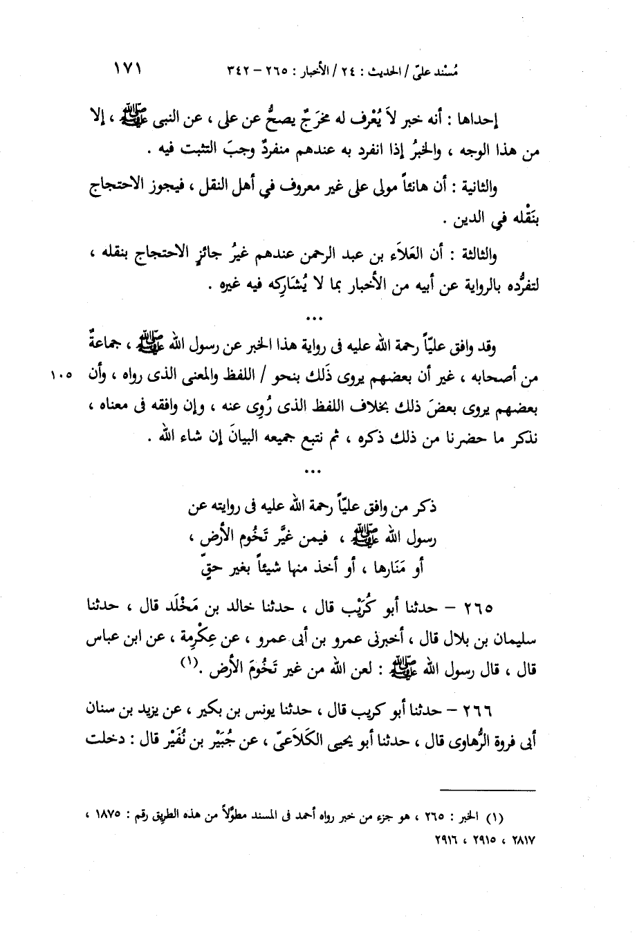 265 - حَدَّثَنَا أَبُو كُرَيْبٍ، قَالَ: حَدَّثَنَا خَالِدُ بْنُ مَخْلَدٍ، قَالَ: حَدَّثَنَا سُلَيْمَانُ بْنُ بِلَالٍ، قَالَ: أَخْبَرَنِي عَمْرُو بْنُ أَبِي عَمْرٍو، عَنْ عِكْرِمَةَ، عَنِ ابْنِ عَبَّاسٍ، قَالَ: قَالَ رَسُولُ اللَّهِ صَلَّى اللهُ عَلَيْهِ وَسَلَّمَ: «§لَعَنَ اللَّهُ مَنْ غَيَّرَ تُخُومَ الْأَرْضِ»