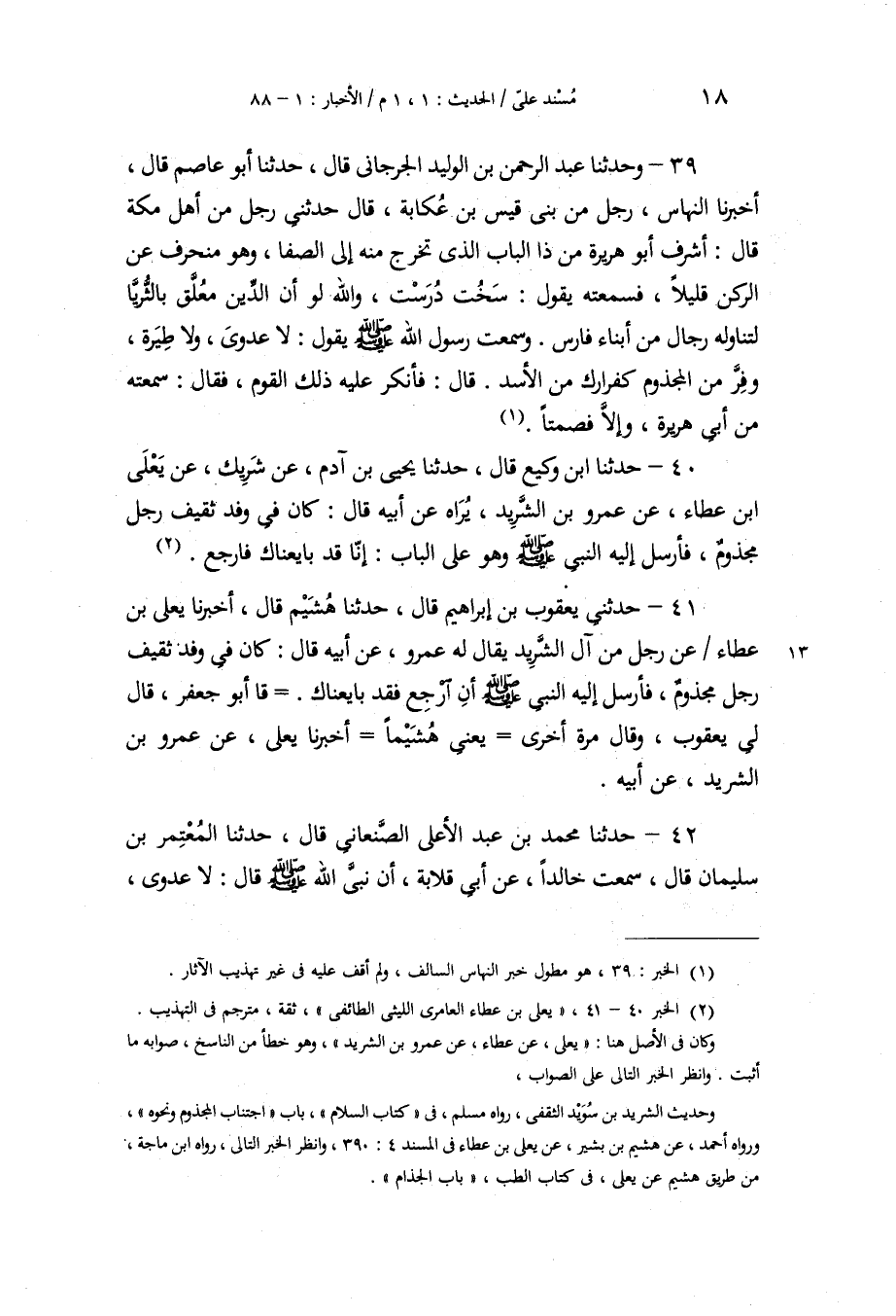 39 - وَحَدَّثَنَا عَبْدُ الرَّحْمَنِ بْنُ الْوَلِيدِ الْجُرْجَانِيُّ، قَالَ: حَدَّثَنَا أَبُو عَاصِمٍ، قَالَ: أَخْبَرَنَا النَّهَّاسُ، رَجُلٌ مِنْ بَنِي قَيْسِ بْنِ عُكَابَةَ، قَالَ: حَدَّثَنِي رَجُلٌ، مِنْ أَهْلِ مَكَّةَ قَالَ: أَشْرَفَ أَبُو هُرَيْرَةَ مِنْ ذَا الْبَابِ الَّذِي تَخْرُجُ مِنْهُ إِلَى الصَّفَا، وَهُوَ مُنْحَرِفٌ عَنِ الرُّكْنِ قَلِيلًا، فَسَمِعْتُهُ يَقُولُ: سَخُتْ دُرَسَتْ، وَاللَّهِ لَوْ أَنَّ الدِّينَ مُعَلَّقٌ بِالثُّرَيَّا لَتَنَاوَلَهُ رِجَالٌ مِنْ أَبْنَاءِ فَارِسٍ، وَسَمِعْتُ رَسُولَ اللَّهِ صَلَّى اللهُ عَلَيْهِ وَسَلَّمَ يَقُولُ: «§لَا عَدْوَى، وَلَا طِيَرَةَ، وَفِرَّ مِنَ الْمَجْذُومِ كَفِرَارِكَ مِنَ الْأَسَدِ» قَالَ: «فَأَنْكَرَ عَلَيْهِ ذَلِكَ الْقَوْمُ» فَقَالَ: سَمِعْتُهُ مِنْ أَبِي هُرَيْرَةَ، وَإِلَّا فَصَمْتًا