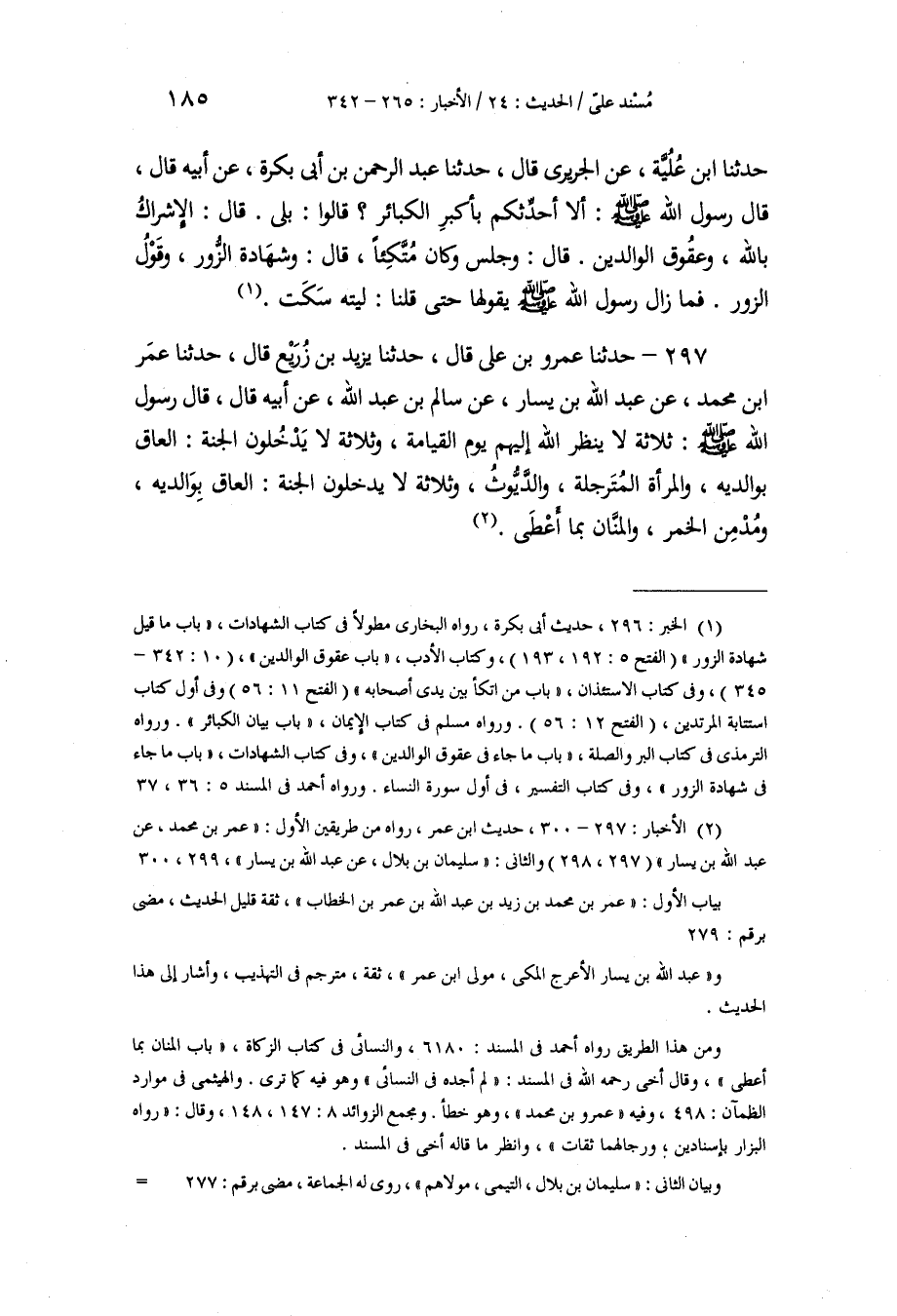 297 - حَدَّثَنَا عَمْرُو بْنُ عَلِيٍّ، قَالَ: حَدَّثَنَا يَزِيدُ بْنُ زُرَيْعٍ، قَالَ: حَدَّثَنَا عُمَرُ بْنُ مُحَمَّدٍ، عَنْ عَبْدِ اللَّهِ بْنِ يَسَارٍ، عَنْ سَالِمِ بْنِ عَبْدِ اللَّهِ، عَنْ أَبِيهِ قَالَ: قَالَ رَسُولُ اللَّهِ صَلَّى اللهُ عَلَيْهِ وَسَلَّمَ: " §ثَلَاثَةٌ لَا يَنْظُرُ اللَّهُ إِلَيْهِمْ يَوْمَ الْقِيَامَةِ، وَثَلَاثَةٌ لَا يَدْخُلُونَ الْجَنَّةَ: الْعَاقُّ بِوَالِدَيْهِ، وَالْمَرْأَةُ الْمُتَرَجِّلَةُ، وَالدَّيُّوثُ. وَثَلَاثَةٌ لَا يَدْخُلُونَ الْجَنَّةَ: الْعَاقُّ بِوَالِدَيْهِ، وَمُدْمِنُ الْخَمْرِ، وَالْمَنَّانُ بِمَا أَعْطَى "