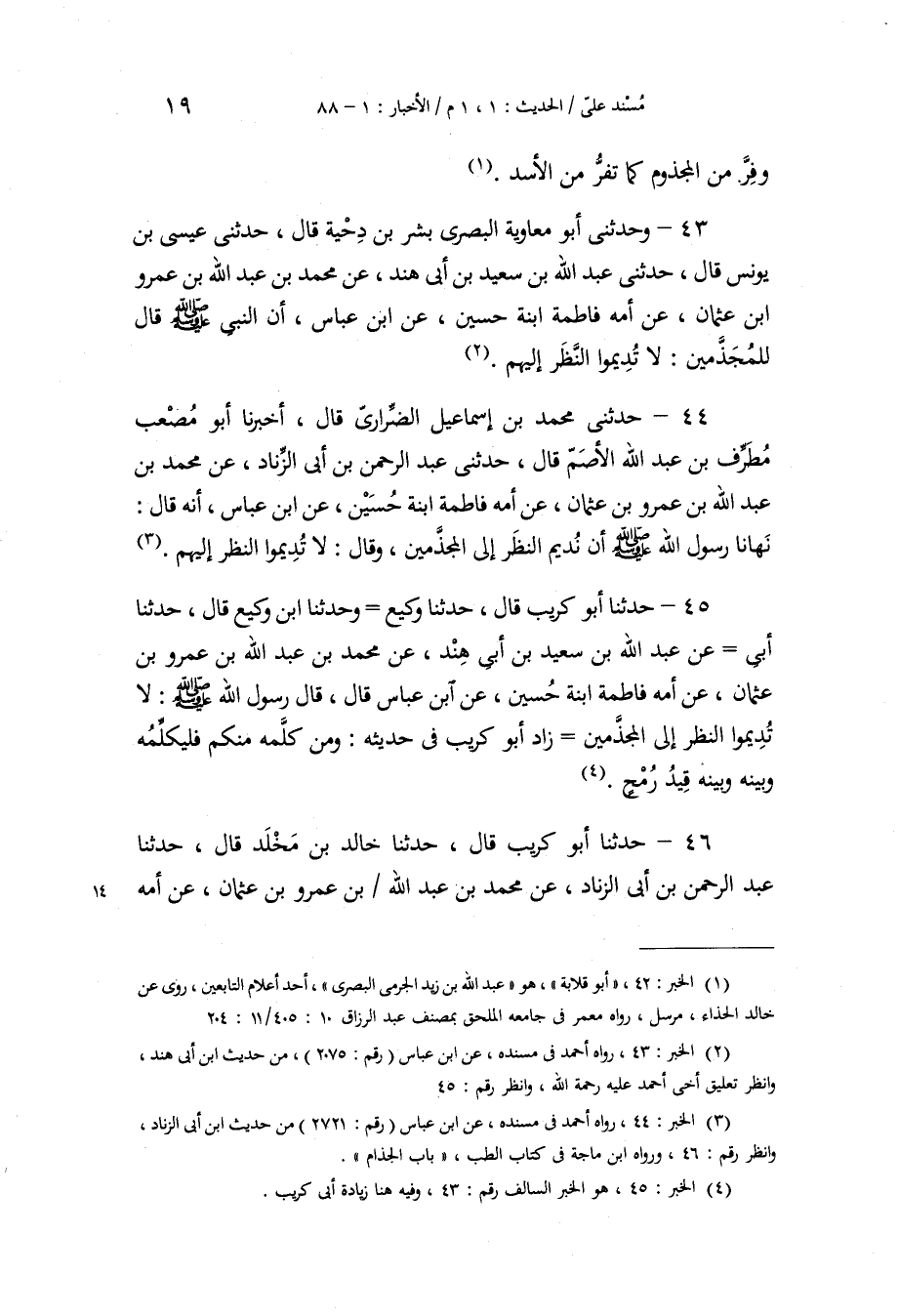 43 - وَحَدَّثَنِي أَبُو مُعَاوِيَةَ الْبَصْرِيُّ بِشْرُ بْنُ دِحْيَةَ، قَالَ: حَدَّثَنِي عِيسَى بْنُ يُونُسَ، قَالَ: حَدَّثَنِي عَبْدُ اللَّهِ بْنُ سَعِيدِ بْنِ أَبِي هِنْدٍ، عَنْ مُحَمَّدِ بْنِ عَبْدِ اللَّهِ بْنِ عَمْرِو بْنِ عُثْمَانَ، عَنْ أُمِّهِ فَاطِمَةَ ابْنَةِ حُسَيْنٍ، عَنِ ابْنِ عَبَّاسٍ، أَنَّ النَّبِيَّ صَلَّى اللهُ عَلَيْهِ وَسَلَّمَ قَالَ لِلْمُجَذَّمِينَ: «§لَا تُدِيمُوا النَّظَرَ إِلَيْهِمْ»