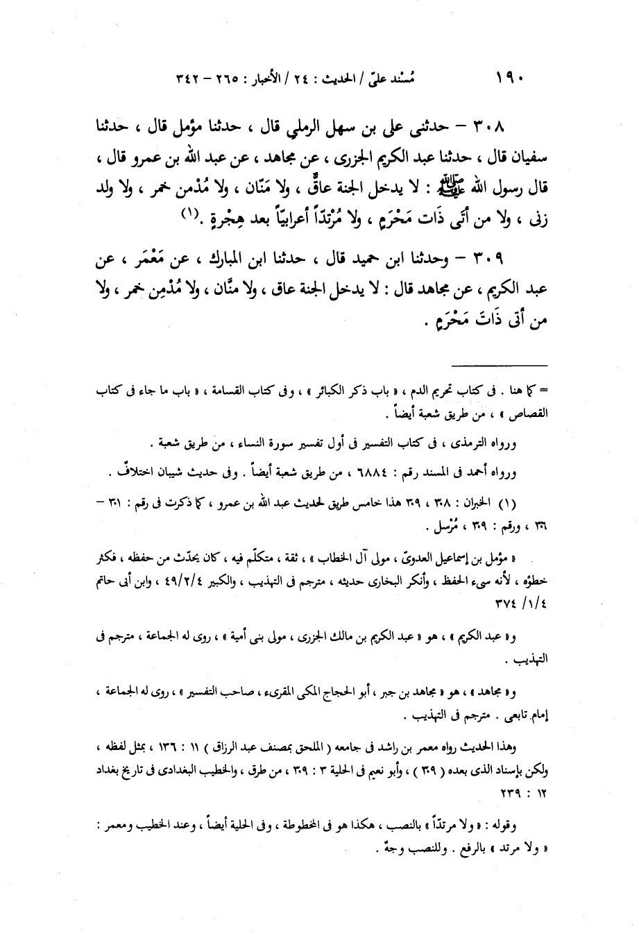 309 - وَحَدَّثَنَا ابْنُ حُمَيْدٍ، قَالَ: حَدَّثَنَا ابْنُ الْمُبَارَكِ، عَنْ مَعْمَرٍ، عَنْ عَبْدِ الْكَرِيمِ، عَنْ مُجَاهِدٍ، قَالَ: «§لَا يَدْخُلُ الْجَنَّةَ عَاقٌّ، وَلَا مَنَّانٌ، وَلَا مُدْمِنُ خَمْرٍ، وَلَا مَنْ أَتَى ذَاتَ مَحْرَمٍ»