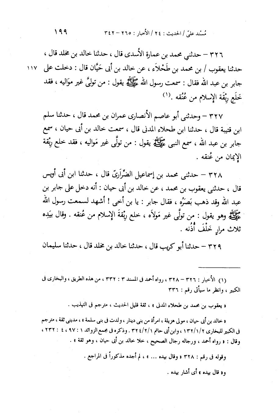 326 - حَدَّثَنِي مُحَمَّدُ بْنُ عُمَارَةَ الْأَسَدِيُّ، قَالَ: حَدَّثَنَا خَالِدُ بْنُ مَخْلَدٍ، قَالَ: حَدَّثَنَا يَعْقُوبُ بْنُ مُحَمَّدِ بْنِ طَحْلَاءَ، عَنْ خَالِدِ بْنِ أَبِي حَيَّانَ، قَالَ: دَخَلْتُ عَلَى جَابِرِ بْنِ عَبْدِ اللَّهِ فَقَالَ: سَمِعْتُ رَسُولَ اللَّهِ صَلَّى اللهُ عَلَيْهِ وَسَلَّمَ يَقُولُ: «§مَنْ تَوَلَّى غَيْرَ مَوَالِيهِ، فَقَدْ خَلَعَ رِبْقَةَ الْإِسْلَامِ مِنْ عُنُقِهِ»
