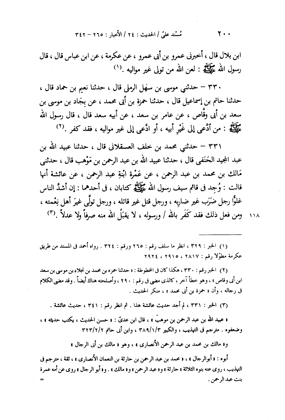 330 - حَدَّثَنِي مُوسَى بْنُ سَهْلٍ الرَّمْلِيُّ، قَالَ: حَدَّثَنَا نُعَيْمُ بْنُ حَمَّادٍ، قَالَ: حَدَّثَنَا حَاتِمُ بْنُ إِسْمَاعِيلَ، قَالَ: حَدَّثَنَا حَمْزَةُ بْنُ أَبِي مُحَمَّدٍ، عَنْ بِجَادِ بْنِ مُوسَى بْنِ سَعْدِ بْنِ أَبِي وَقَّاصٍ، عَنْ عَامِرِ بْنِ سَعْدٍ، عَنْ أَبِيهِ سَعْدٍ قَالَ: قَالَ رَسُولُ اللَّهِ صَلَّى اللهُ عَلَيْهِ وَسَلَّمَ: «§مَنِ ادَّعَى إِلَى غَيْرِ أَبِيهِ، أَوِ ادَّعَى إِلَى غَيْرِ مَوَالِيهِ، فَقَدْ كَفَرَ»