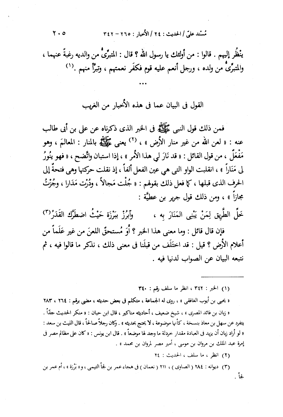 §الْقَوْلُ فِي الْبَيَانِ عَمَّا فِي هَذِهِ الْأَخْبَارِ مِنَ الْغَرِيبِ " فَمِنْ ذَلِكَ قَوْلُ النَّبِيِّ صَلَّى اللهُ عَلَيْهِ وَسَلَّمَ فِي الْخَبَرِ الَّذِي ذَكَرْنَاهُ عَنْ عَلِيِّ بْنِ أَبِي طَالِبٍ عَنْهُ: «لَعَنَ اللَّهُ مَنْ غَيَّرَ مَنَارَ الْأَرْضِ» يَعْنِي صَلَّى اللهُ عَلَيْهِ وَسَلَّمَ بِالْمَنَارِ: الْمَعَالِمَ، وَهُوَ مَفْعَلٌ، مِنْ قَوْلِ الْقَائِلِ: قَدْ نَارَ لِي هَذَا الْأَمْرُ، إِذَا اسْتَبَانَ وَاتَّضَحَ، فَهُوَ يُنَوِّرُ لِي مَنَارًا، انْقَلَبَتِ الْوَاوُ الَّتِي هِيَ عَيْنُ الْفِعْلِ أَلِفًا، إِذْ نُقِلَتْ حَرَكَتُهَا وَهِيَ فَتْحَةٌ إِلَى الْحَرْفِ الَّذِي قَبْلَهَا، كَمَا فُعِلَ ذَلِكَ بِقَوْلِهِمْ: جُلْتُ مَجَالًا، وَدُرْتُ مَدَارًا، وَجُزْتُ مَجَازًا، وَمِنْ ذَلِكَ قَوْلُ جَرِيرِ بْنِ عَطِيَّةَ: