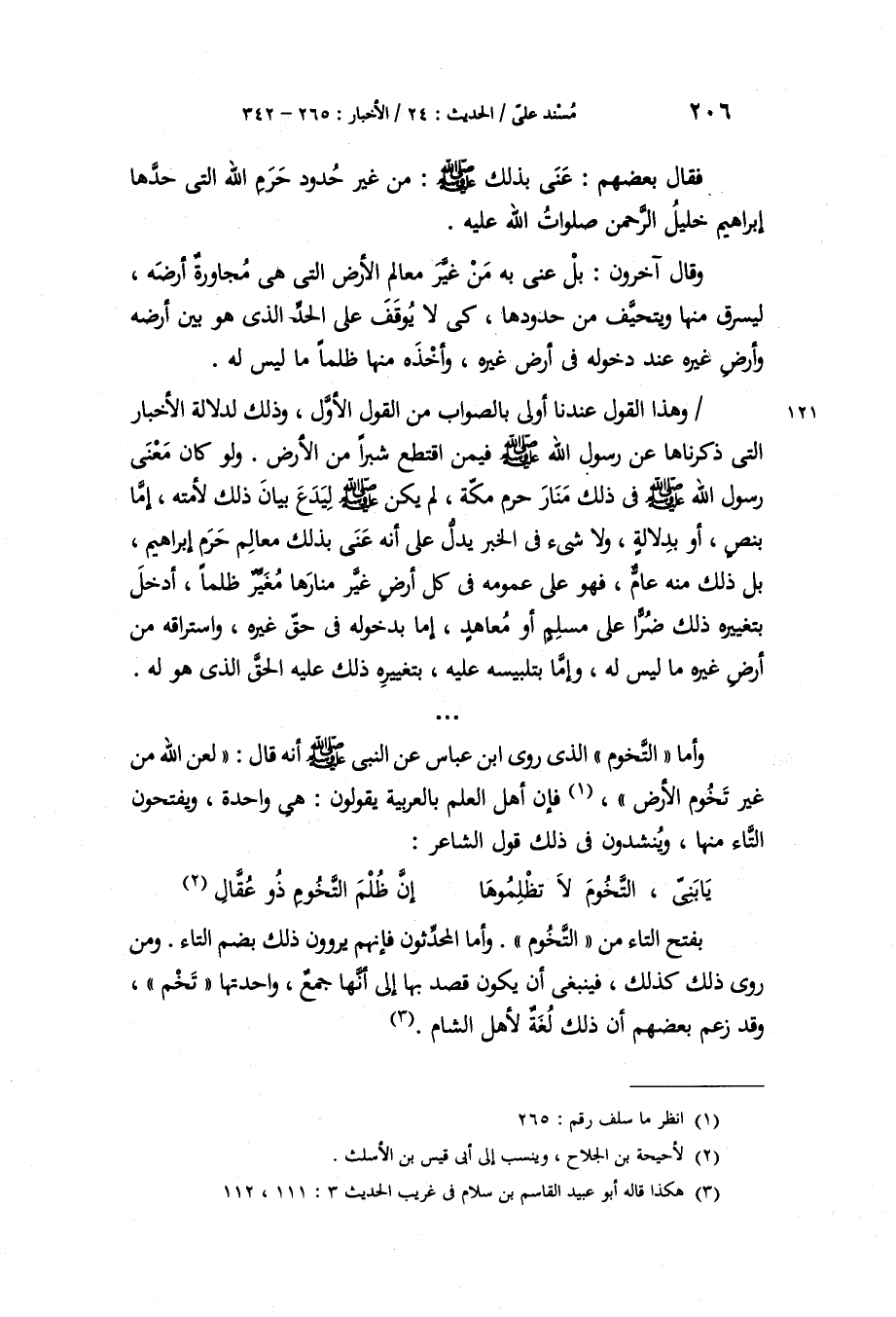 فَقَالَ بَعْضُهُمْ: عَنَى بِذَلِكَ صَلَّى اللهُ عَلَيْهِ وَسَلَّمَ: مَنْ غَيَّرَ حُدُودَ حَرَمِ اللَّهِ الَّتِي حَدَّهَا إِبْرَاهِيمُ خَلِيلُ الرَّحْمَنِ صَلَوَاتُ اللَّهِ عَلَيْهِ. وَقَالَ آخَرُونَ: بَلْ عَنَى بِهِ مَنْ غَيَّرَ مَعَالِمَ الْأَرْضِ الَّتِي هِيَ مُجَاوِرَةٌ أَرْضَهُ لِيَسْرِقَ مِنْهَا , وَيَتَحَيَّفَ مِنْ حُدُودِهَا، كَيْ لَا يُوقَفَ عَلَى الْحَدِّ الَّذِي هُوَ بَيْنَ أَرْضِهِ وَأَرْضِ غَيْرِهِ عِنْدَ دُخُولِهِ فِي أَرْضِ غَيْرِهِ، وَأَخْذِهِ مِنْهَا ظُلْمًا مَا لَيْسَ لَهُ. وَهَذَا الْقَوْلُ عِنْدَنَا أَوْلَى بِالصَّوَابِ مِنَ الْقَوْلِ الْأَوَّلِ، وَذَلِكَ لِدَلَالَةِ الْأَخْبَارِ الَّتِي ذَكَرْنَاهَا عَنْ رَسُولِ اللَّهِ صَلَّى اللهُ عَلَيْهِ وَسَلَّمَ فِيمَنِ اقْتَطَعَ شِبْرًا مِنَ الْأَرْضِ، وَلَوْ كَانَ مَعْنَى رَسُولِ اللَّهِ صَلَّى اللهُ عَلَيْهِ وَسَلَّمَ فِي ذَلِكَ مَنَارَ حَرَمِ مَكَّةَ، لَمْ يَكُنْ صَلَّى اللهُ عَلَيْهِ وَسَلَّمَ لِيَدَعَ بَيَانَ ذَلِكَ لِأُمَّتِهِ، إِمَّا بِنَصٍّ، أَوْ بِدَلَالَةٍ، وَلَا شَيْءَ فِي الْخَبَرِ يَدُلُّ عَلَى أَنَّهُ عَنَى بِذَلِكَ مَعَالِمَ حَرَمِ إِبْرَاهِيمَ، بَلْ ذَلِكَ مِنْهُ عَامٌّ، فَهُوَ عَلَى عُمُومِهِ فِي كُلِّ أَرْضٍ غَيَّرَ مَنَارُهَا مُغَيِّرٌ ظُلْمًا، أَدْخَلَ بِتَغْيِيرِهِ ذَلِكَ ضُرًّا عَلَى مُسْلِمٍ أَوْ مُعَاهَدٍ، إِمَّا بِدُخُولِهِ فِي حَقِّ غَيْرِهِ، وَاسْتِرَاقِهِ مِنْ أَرْضِ غَيْرِهِ مَا لَيْسَ لَهُ، وَإِمَّا بِتَلْبِيسِهِ عَلَيْهِ، بِتَغْيِيرِهِ ذَلِكَ عَلَيْهِ الْحَقَّ الَّذِي هُوَ لَهُ. وَأَمَّا التَّخُومُ الَّذِي رَوَى ابْنُ عَبَّاسٍ، عَنِ النَّبِيِّ صَلَّى اللهُ عَلَيْهِ وَسَلَّمَ أَنَّهُ قَالَ: «لَعَنَ اللَّهُ مَنْ غَيَّرَ تُخُومَ الْأَرْضِ» ، فَإِنَّ أَهْلَ الْعِلْمِ بِالْعَرَبِيَّةِ يَقُولُونَ: هِيَ وَاحِدَةٌ، وَيَفْتَحُونَ التَّاءَ مِنْهَا، وَيُنْشِدُونَ فِي ذَلِكَ قَوْلَ الشَّاعِرِ: