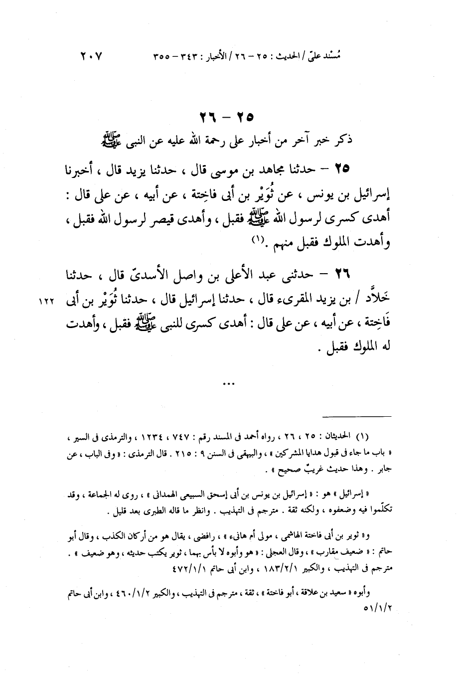 حَدَّثَنِي عَبْدُ الْأَعْلَى بْنُ وَاصِلٍ الْأَسَدِيُّ، قَالَ: حَدَّثَنَا خَلَّادُ بْنُ يَزِيدَ الْمُقْرِئُ، قَالَ: حَدَّثَنَا إِسْرَائِيلُ، قَالَ: حَدَّثَنَا ثُوَيْرُ بْنُ أَبِي فَاخِتَةَ، عَنْ أَبِيهِ، عَنْ عَلِيٍّ، قَالَ: «§أَهْدَى كِسْرَى لِلنَّبِيِّ صَلَّى اللهُ عَلَيْهِ وَسَلَّمَ فَقَبِلَ، وَأَهْدَتْ لَهُ الْمُلُوكُ فَقَبِلَ»