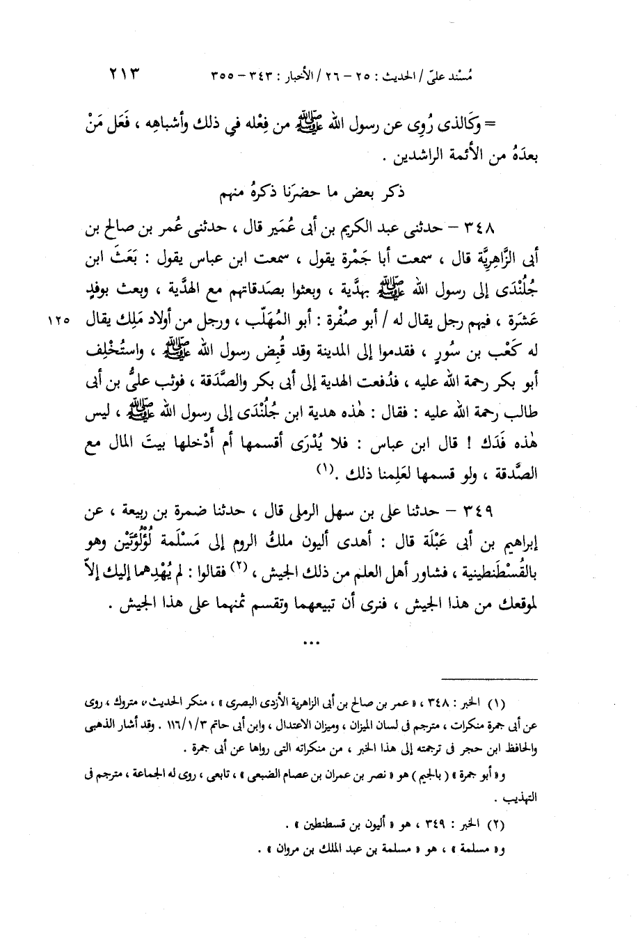 348 - حَدَّثَنِي عَبْدُ الْكَرِيمِ بْنُ أَبِي عُمَيْرٍ، قَالَ: حَدَّثَنِي عُمَرُ بْنُ صَالِحِ بْنِ أَبِي الزَّاهِرِيَّةِ، قَالَ: سَمِعْتُ أَبَا جَمْرَةَ، يَقُولُ: سَمِعْتُ ابْنَ عَبَّاسٍ، يَقُولُ: " §بَعَثَ ابْنُ جُلُنْدَى إِلَى رَسُولِ اللَّهِ صَلَّى اللهُ عَلَيْهِ وَسَلَّمَ بِهَدِيَّةٍ، وَبَعَثُوا بِصَدَقَاتِهِمْ مَعَ الْهَدِيَّةِ، وَبَعَثَ بِوَفْدٍ عَشْرَةً، فِيهِمْ رَجُلٌ يُقَالُ لَهُ أَبُو صُفْرَةَ: أَبُو الْمُهَلَّبِ، وَرَجُلٌ مِنْ أَوْلَادِ مَلِكٍ يُقَالُ لَهُ كَعْبُ بْنُ سُورٍ، فَقَدِمُوا إِلَى الْمَدِينَةِ وَقَدْ قُبِضَ رَسُولُ اللَّهِ صَلَّى اللهُ عَلَيْهِ وَسَلَّمَ، وَاسْتُخْلِفَ أَبُو بَكْرٍ رَحْمَةُ اللَّهِ عَلَيْهِ، فَدُفِعَتِ الْهَدِيَّةُ إِلَى أَبِي بَكْرٍ وَالصَّدَقَةُ، فَوَثَبَ عَلِيُّ بْنُ أَبِي طَالِبٍ رَحْمَةُ اللَّهِ عَلَيْهِ فَقَالَ: هَذِهِ هَدِيَّةُ ابْنِ جُلُنْدَى إِلَى رَسُولِ اللَّهِ صَلَّى اللهُ عَلَيْهِ وَسَلَّمَ، لَيْسَ هَذِهِ فَدَكَ , قَالَ ابْنُ عَبَّاسٍ: فَلَا يُدْرَى أَقْسَمَهَا أَمْ أَدْخَلَهَا بَيْتَ الْمَالِ مَعَ الصَّدَقَةِ؟ وَلَوْ قَسَمَهَا لَعَلِمْنَا ذَلِكَ "