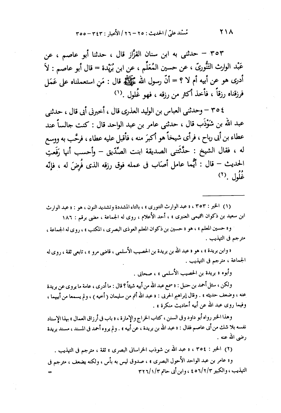 353 - حَدَّثَنِي بِهِ ابْنُ سِنَانٍ الْقَزَّازُ، قَالَ: حَدَّثَنَا أَبُو عَاصِمٍ، عَنْ عَبْدِ الْوَارِثِ التَّنُّورِيِّ، عَنْ حُسَيْنٍ الْمُعَلِّمِ، عَنِ ابْنِ بُرَيْدَةَ، قَالَ أَبُو عَاصِمٍ: لَا أَدْرِي هُوَ عَنْ أَبِيهِ أَمْ لَا؟ أَنَّ رَسُولَ اللَّهِ صَلَّى اللهُ عَلَيْهِ وَسَلَّمَ قَالَ: «§مَنِ اسْتَعْمَلْنَاهُ عَلَى عَمَلٍ فَرَزَقْنَاهُ رِزْقًا، فَأَخَذَ أَكْثَرَ مِنْ رِزْقِهِ، فَهُوَ غُلُولٌ»