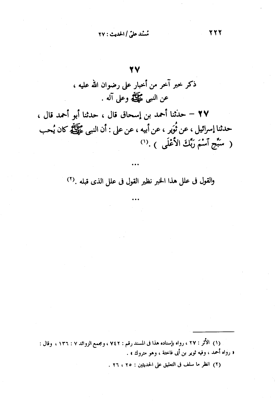 حَدَّثَنَا أَحْمَدُ بْنُ إِسْحَاقَ، قَالَ: حَدَّثَنَا أَبُو أَحْمَدَ، قَالَ: حَدَّثَنَا إِسْرَائِيلُ، عَنْ ثُوَيْرٍ، عَنْ أَبِيهِ، عَنْ عَلِيٍّ، " §أَنَّ النَّبِيَّ صَلَّى اللهُ عَلَيْهِ وَسَلَّمَ كَانَ يُحِبُّ: {سَبِّحِ اسْمَ رَبِّكَ الْأَعْلَى} [الْأَعْلَى: 1] " وَالْقَوْلُ فِي عِلَلِ هَذَا الْخَبَرِ نَظِيرُ الْقَوْلِ فِي عِلَلِ الَّذِي قَبْلَهُ