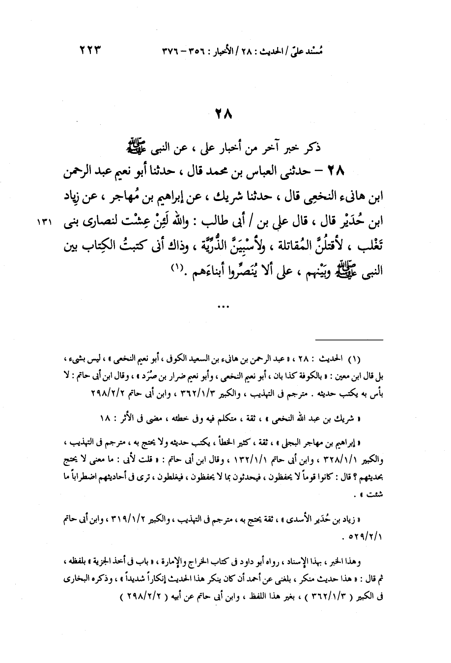 حَدَّثَنِي الْعَبَّاسُ بْنُ مُحَمَّدٍ، قَالَ: حَدَّثَنَا أَبُو نُعَيْمٍ عَبْدُ الرَّحْمَنِ بْنُ هَانِئٍ النَّخَعِيُّ، قَالَ: حَدَّثَنَا شَرِيكٌ، عَنْ إِبْرَاهِيمَ بْنِ مُهَاجِرٍ، عَنْ زِيَادِ بْنِ حُدَيْرٍ، قَالَ: قَالَ عَلِيُّ بْنُ أَبِي طَالِبٍ: «§وَاللَّهِ لَئِنْ عِشْتُ لِنَصَارَى بَنِي تَغْلِبَ، لَأَقْتُلَنَّ الْمُقَاتِلَةَ، وَلَأَسْبِيَنَّ الذُّرِّيَّةَ، وَذَاكَ أَنَّى كَتَبْتُ الْكِتَابَ بَيْنَ النَّبِيِّ صَلَّى اللهُ عَلَيْهِ وَسَلَّمَ وَبَيْنَهُمْ، عَلَى أَلَّا يُنَصِّرُوا أَبْنَاءَهُمْ»