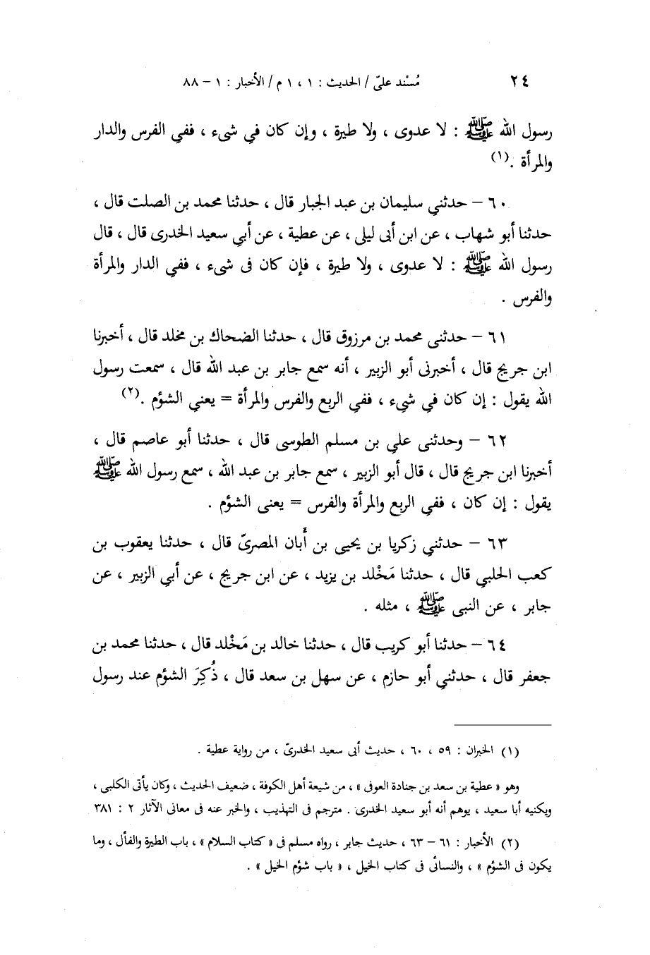 60 - حَدَّثَنِي سُلَيْمَانُ بْنُ عَبْدِ الْجَبَّارِ، قَالَ: حَدَّثَنَا مُحَمَّدُ بْنُ الصَّلْتِ، قَالَ: حَدَّثَنَا أَبُو شِهَابٍ، عَنِ ابْنِ أَبِي لَيْلَى، عَنْ عَطِيَّةَ، عَنْ أَبِي سَعِيدٍ الْخُدْرِيِّ، قَالَ: قَالَ رَسُولُ اللَّهِ صَلَّى اللهُ عَلَيْهِ وَسَلَّمَ: «§لَا عَدْوَى، وَلَا طِيَرَةَ، فَإِنْ كَانَ فِي شَيْءٍ، فَفِي الدَّارِ وَالْمَرْأَةِ وَالْفَرَسِ»