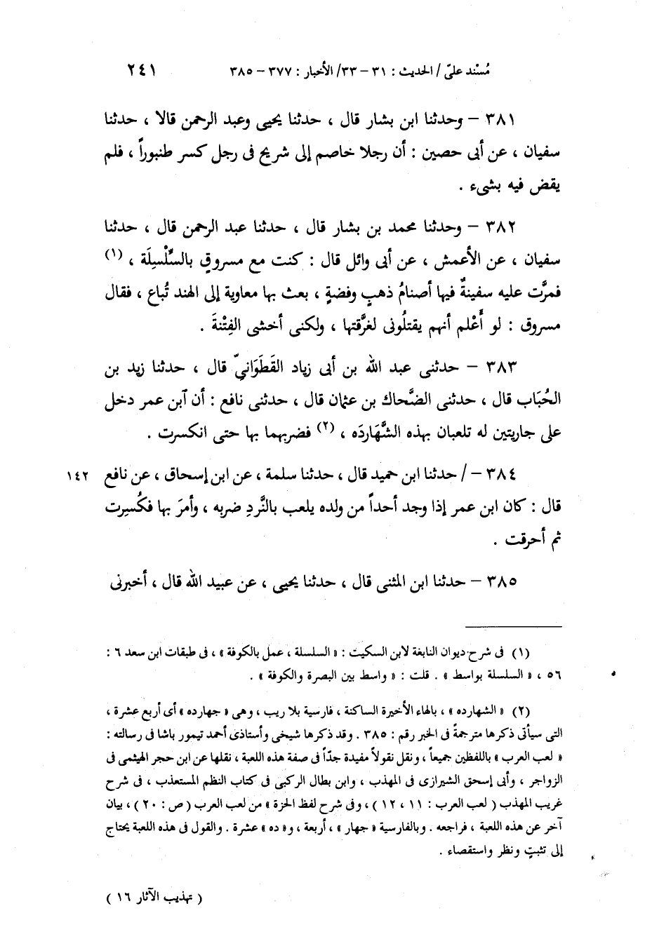 383 - حَدَّثَنِي عَبْدُ اللَّهِ بْنُ أَبِي زِيَادٍ الْقَطَوَانِيُّ، قَالَ: حَدَّثَنَا زَيْدُ بْنُ الْحُبَابِ، قَالَ: حَدَّثَنِي الضَّحَّاكُ بْنُ عُثْمَانَ، قَالَ: حَدَّثَنِي نَافِعٌ، أَنَّ ابْنَ عُمَرَ، «§دَخَلَ عَلَى جَارِيَتَيْنِ لَهُ تَلْعَبَانِ بِهَذِهِ الشَّهَارَدَهْ، فَضَرَبَهُمَا بِهَا حَتَّى انْكَسَرَتْ»