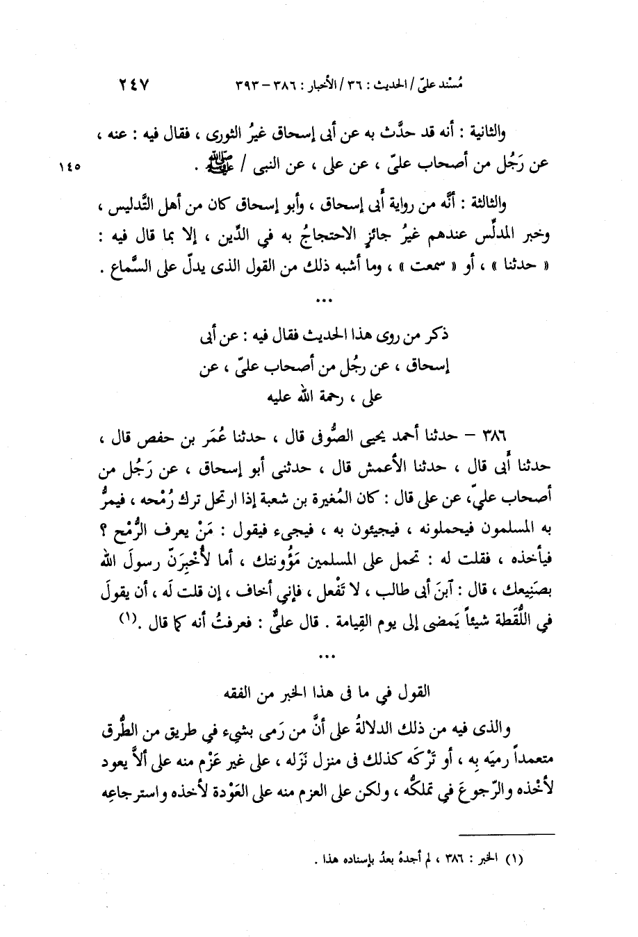 386 - حَدَّثَنَا أَحْمَدُ بْنُ يَحْيَى الصُّوفِيُّ، قَالَ: حَدَّثَنَا عُمَرُ بْنُ حَفْصٍ، قَالَ: حَدَّثَنَا أَبِي قَالَ: حَدَّثَنَا الْأَعْمَشُ، قَالَ: حَدَّثَنِي أَبُو إِسْحَاقَ , عَنْ رَجُلٍ مِنْ أَصْحَابِ عَلِيٍّ، عَنْ عَلِيٍّ، قَالَ: " §كَانَ الْمُغِيرَةُ بْنُ شُعْبَةَ إِذَا ارْتَحَلَ تَرَكَ رُمْحَهُ، فَيَمُرُّ بِهِ الْمُسْلِمُونَ فَيَحْمِلُونَهُ، فَيَجِيئُونَ بِهِ، فَيَجِيءُ فَيَقُولُ: مَنْ يَعْرِفُ الرُّمْحَ؟ فَيَأْخُذُهُ، فَقُلْتُ لَهُ: تَحْمِلُ عَلَى الْمُسْلِمِينَ مَؤُونَتَكَ، أَمَا لَأُخْبِرَنَّ رَسُولَ اللَّهِ بِصَنِيعِكَ، قَالَ: ابْنَ أَبِي طَالِبٍ، لَا تَفْعَلْ، فَإِنِّي أَخَافُ إِنْ قُلْتَ لَهُ أَنْ يَقُولَ فِي اللُّقَطَةِ شَيْئًا يَمْضِي إِلَى يَوْمِ الْقِيَامَةِ. قَالَ عَلِيٌّ: فَعَرَفْتُ أَنَّهُ كَمَا قَالَ "