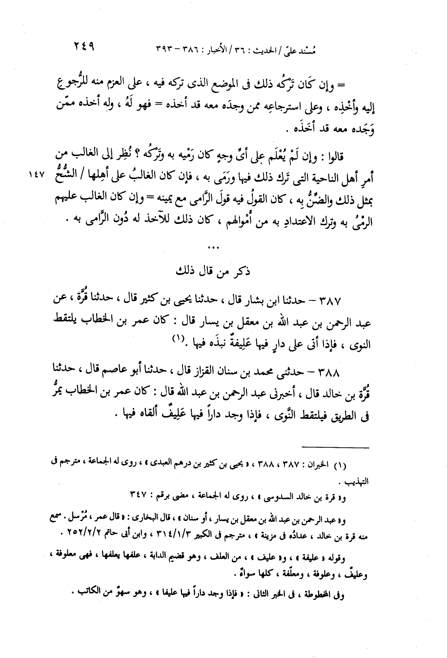 387 - حَدَّثَنَا ابْنُ بَشَّارٍ، قَالَ: حَدَّثَنَا يَحْيَى بْنُ كَثِيرٍ، قَالَ: حَدَّثَنَا قُرَّةُ , عَنْ عَبْدِ الرَّحْمَنِ بْنِ عَبْدِ اللَّهِ بْنِ مَعْقِلِ بْنِ يَسَارٍ، قَالَ: كَانَ عُمَرُ بْنُ الْخَطَّابِ «§يَلْتَقِطُ النَّوَى، فَإِذَا أَتَى عَلَى دَارٍ فِيهَا عَلِيفَةٌ نَبَذَهُ فِيهَا»