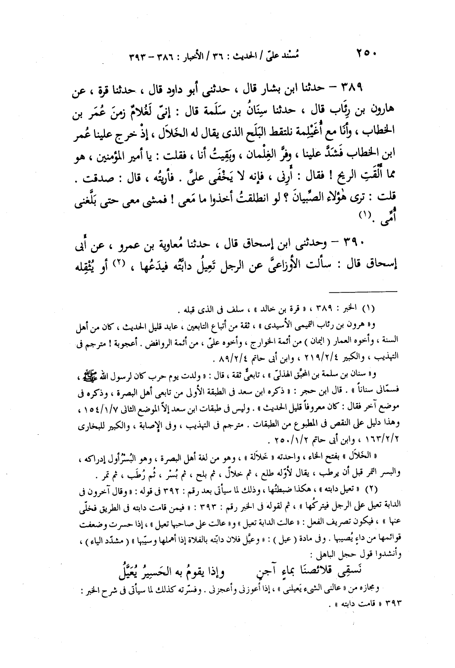 389 - حَدَّثَنَا ابْنُ بَشَّارٍ، قَالَ: حَدَّثَنِي أَبُو دَاوُدَ، قَالَ: حَدَّثَنَا قُرَّةُ , عَنْ هَارُونَ بْنِ رِئَابٍ، قَالَ: حَدَّثَنَا سِنَانُ بْنُ سَلَمَةَ، قَالَ: إِنِّي لَغُلَامٌ زَمَنَ عُمَرَ بْنِ الْخَطَّابِ، وَأَنَا مَعَ أُغَيْلِمَةٍ نَلْتَقِطُ الْبَلَحَ الَّذِي يُقَالُ لَهُ الْخَلَالُ، إِذْ خَرَجَ عَلَيْنَا عُمَرُ بْنُ الْخَطَّابِ، فَشَدَّ عَلَيْنَا، وَفَرَّ الْغِلْمَانُ، وَبَقِيَتُ أَنَا، فَقُلْتُ: " §يَا أَمِيرَ الْمُؤْمِنِينَ، هُوَ مِمَّا أَلْقَتِ الرِّيحُ، فَقَالَ: أَرِنِي، فَإِنَّهُ لَا يَخْفَى عَلَيَّ. فَأَرَيْتُهُ، قَالَ: صَدَقْتَ. قُلْتُ: تَرَى هَؤُلَاءِ الصِّبْيَانَ؟ لَوِ انْطَلَقْتُ أَخَذُوا مَا مَعِي، فَمَشَى مَعِي حَتَّى بَلَّغَنِي أُمِّي "