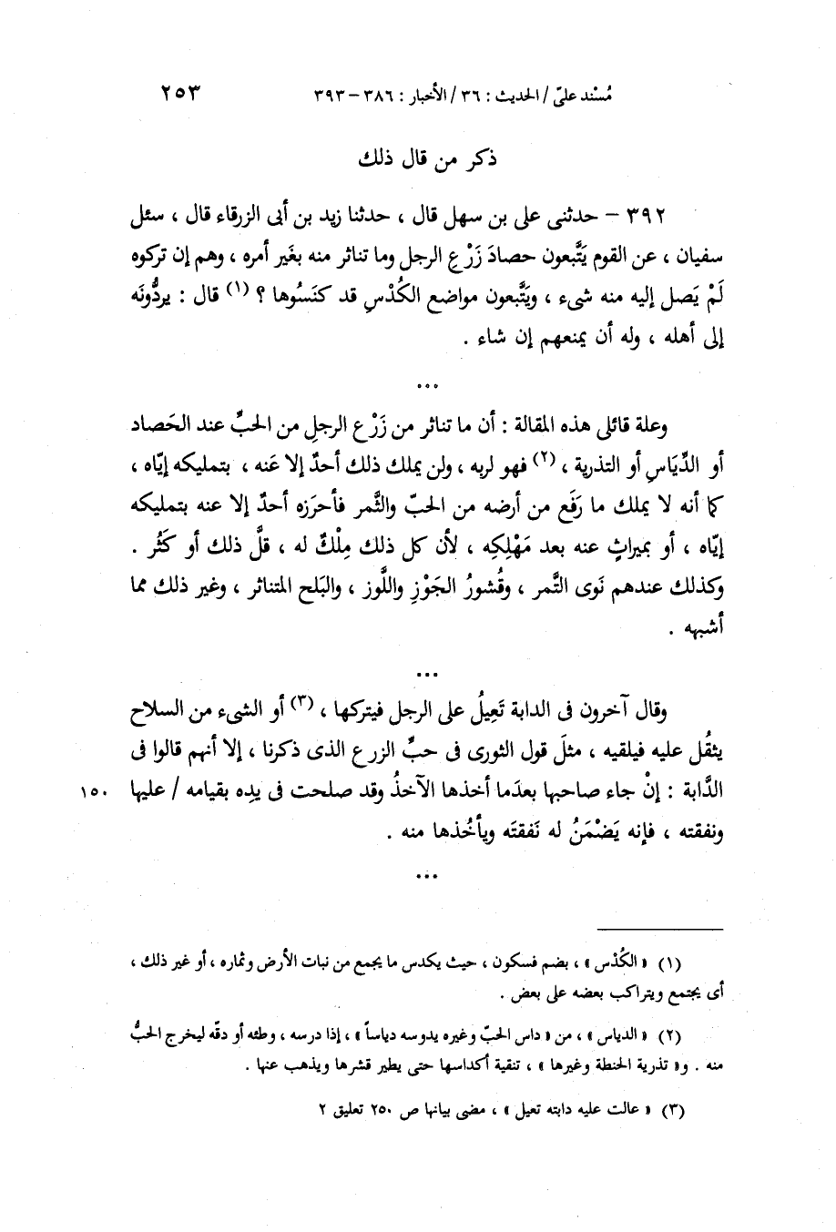 392 - حَدَّثَنِي عَلِيُّ بْنُ سَهْلٍ، قَالَ: حَدَّثَنَا زَيْدُ بْنُ أَبِي الزَّرْقَاءِ، قَالَ: سُئِلَ سُفْيَانُ عَنِ الْقَوْمِ، " يَتَّبِعُونَ حَصَادَ زَرْعِ الرَّجُلِ، وَمَا تَنَاثَرَ مِنْهُ بِغَيْرِ أَمْرِهِ، وَهُمْ إِنْ تَرَكُوهُ لَمْ يَصِلْ إِلَيْهِ مِنْهُ شَيْءٌ، وَيَتَّبِعُونَ مَوَاضِعَ الْكُدْسِ قَدْ كَنَسُوهَا؟ قَالَ: §يَرُدُّونَهُ إِلَى أَهْلِهِ، وَلَهُ أَنْ يَمْنَعَهُمْ إِنْ شَاءَ " وَعِلَّةُ قَائِلِي هَذِهِ الْمَقَالَةِ: أَنَّ مَا تَنَاثَرَ مِنْ زَرْعِ الرَّجُلِ مِنَ الْحَبِّ عِنْدَ الْحَصَادِ أَوِ الدِّيَاسِ، أَوِ التَّذْرِيَةِ، فَهُوَ لِرَبِّهِ، وَلَنْ يَمْلِكَ ذَلِكَ أَحَدٌ إِلَّا عَنْهُ، بِتَمْلِيكِهِ إِيَّاهُ، كَمَا أَنَّهُ لَا يَمْلِكُ مَا رَفَعَ مِنْ أَرْضِهِ مِنَ الْحَبِّ وَالثَّمَرِ فَأَحْرَزَهُ أَحَدٌ، إِلَّا عَنْهُ بِتَمْلِيكِهِ إِيَّاهُ، أَوْ بِمِيرَاثٍ عَنْهُ بَعْدَ مَهْلِكِهِ، لِأَنَّ كُلَّ ذَلِكَ مِلْكٌ لَهُ، قَلَّ ذَلِكَ أَوْ كَثُرَ. وَكَذَلِكَ عِنْدَهُمْ نَوَى التَّمْرِ، وَقُشُورُ الْجَوْزِ، وَاللَّوْزُ، وَالْبَلَحُ الْمُتَنَاثِرُ، وَغَيْرُ ذَلِكَ مِمَّا أَشْبَهَهُ. وَقَالَ آخَرُونَ فِي الدَّابَّةِ تُعِيلُ عَلَى الرَّجُلِ فَيَتْرُكُهَا، أَوِ الشَّيْءِ مِنَ السِّلَاحِ يَثْقُلُ عَلَيْهِ فَيُلْقِيهِ، مِثْلَ قَوْلِ الثَّوْرِيِّ فِي حَبِّ الزَّرْعِ الَّذِي ذَكَرْنَا، إِلَّا أَنَّهُمْ قَالُوا فِي الدَّابَّةِ: إِنْ جَاءَ صَاحِبُهَا بَعْدَمَا أَخَذَهَا الْآخِذُ وَقَدْ صَلُحَتْ فِي يَدِهِ بِقِيَامِهِ عَلَيْهَا وَنَفَقَتِهِ، فَإِنَّهُ يَضْمَنُ لَهُ نَفَقَتُهُ وَيَأْخُذُهَا مِنْهُ