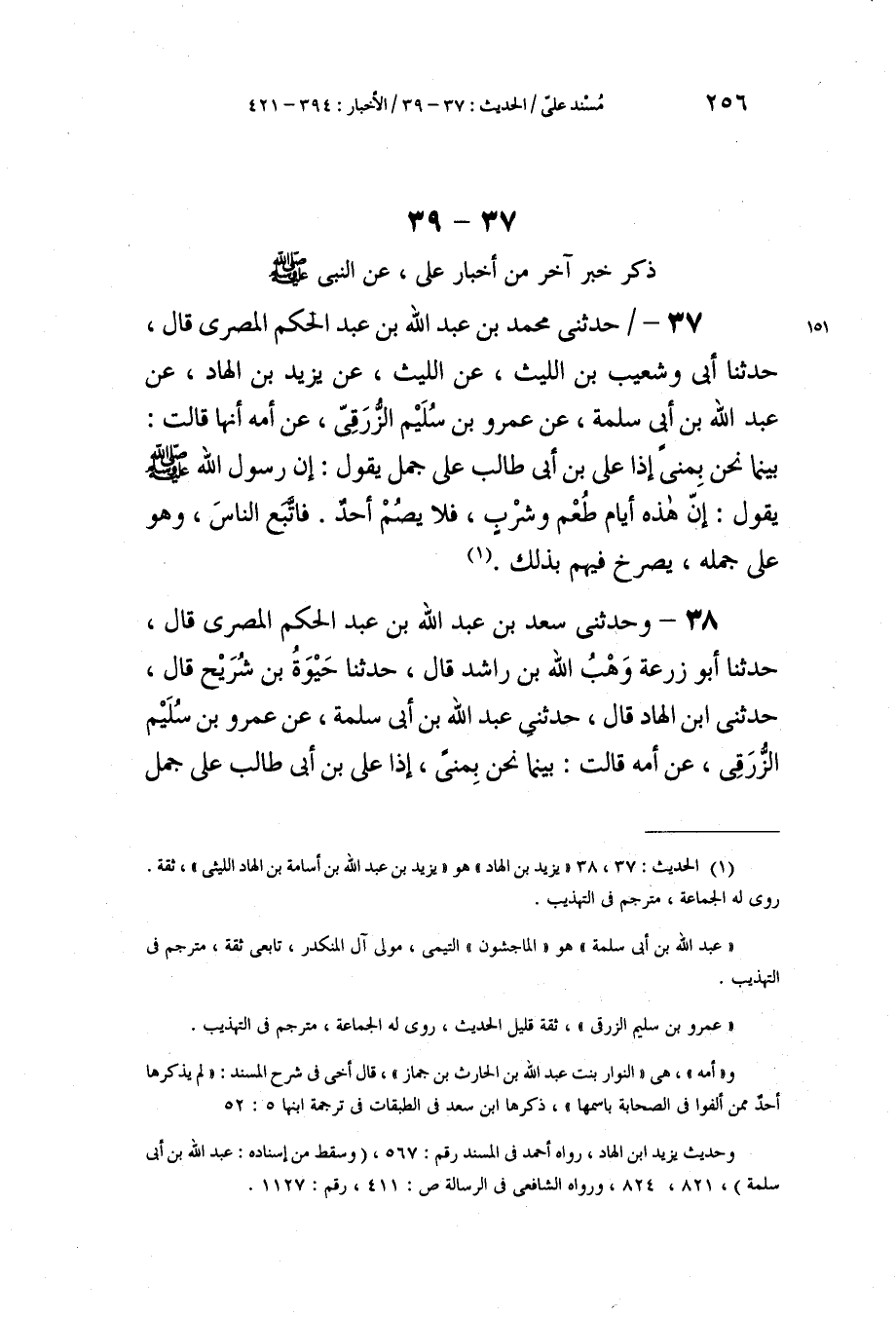 حَدَّثَنِي مُحَمَّدُ بْنُ عَبْدِ اللَّهِ بْنِ عَبْدِ الْحَكَمِ الْمِصْرِيُّ، قَالَ: حَدَّثَنَا أَبِي، وَشُعَيْبُ بْنُ اللَّيْثِ، عَنِ اللَّيْثِ , عَنْ يَزِيدَ بْنِ الْهَادِ , عَنْ عَبْدِ اللَّهِ بْنِ أَبِي سَلَمَةَ , عَنْ عَمْرِو بْنِ سُلَيْمٍ الزُّرَقِيِّ , عَنْ أُمِّهِ، أَنَّهَا قَالَتْ: بَيْنَمَا نَحْنُ بِمِنًى إِذَا عَلِيُّ بْنُ أَبِي طَالِبٍ عَلَى جَمَلٍ يَقُولُ: إِنَّ رَسُولَ اللَّهِ صَلَّى اللهُ عَلَيْهِ وَسَلَّمَ يَقُولُ: «§إِنَّ هَذِهِ أَيَّامُ طُعْمٍ وَشُرْبٍ، فَلَا يَصُمْ أَحَدٌ» فَاتَّبَعَ النَّاسَ وَهُوَ عَلَى جَمَلِهِ، يَصْرُخُ فِيهِمْ بِذَلِكَ