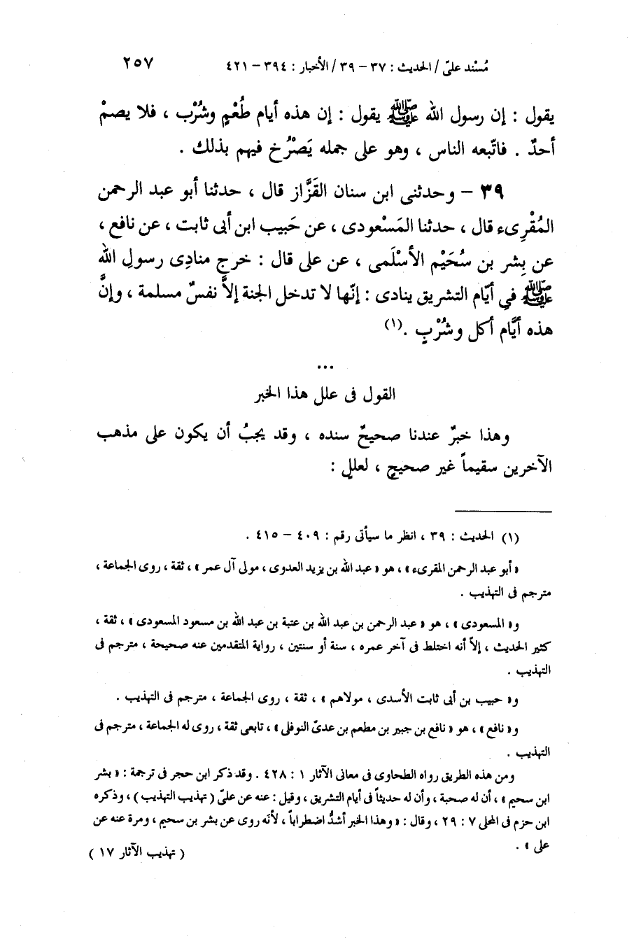 وَحَدَّثَنِي ابْنُ سِنَانٍ الْقَزَّازُ، قَالَ: حَدَّثَنَا أَبُو عَبْدِ الرَّحْمَنِ الْمُقْرِئُ، قَالَ: حَدَّثَنَا الْمَسْعُودِيُّ , عَنْ حَبِيبِ بْنِ أَبِي ثَابِتٍ , عَنْ نَافِعٍ , عَنْ بِشْرِ بْنِ سُحَيْمٍ الْأَسْلَمِيِّ , عَنْ عَلِيٍّ، قَالَ: خَرَجَ مُنَادِي رَسُولِ اللَّهِ صَلَّى اللهُ عَلَيْهِ وَسَلَّمَ فِي أَيَّامِ التَّشْرِيقِ يُنَادِي: «§إِنَّهَا لَا تَدْخُلُ الْجَنَّةَ إِلَّا نَفْسٌ مُسْلِمَةٌ، وَإِنَّ هَذِهِ أَيَّامُ أَكْلٍ وَشُرْبٍ»