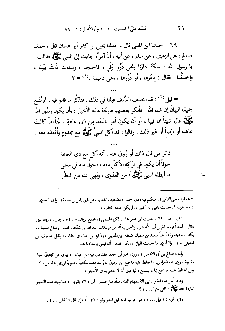 69 - حَدَّثَنَا ابْنُ الْمُثَنَّى، قَالَ: حَدَّثَنَا يَحْيَى بْنُ كَثِيرٍ أَبُو غَسَّانَ، قَالَ: حَدَّثَنَا صَالِحٌ، عَنِ الزُّهْرِيِّ، عَنْ سَالِمٍ، عَنْ أَبِيهِ، أَنَّ امْرَأَةً، جَاءَتْ إِلَى النَّبِيِّ صَلَّى اللهُ عَلَيْهِ وَسَلَّمَ فَقَالَتْ: يَا رَسُولَ اللَّهِ، سَكَنَّا دَارَنَا وَنَحْنُ ذَوُو وَفْرٍ، فَاحْتَجْنَا، وَسَاءَتْ ذَاتُ بَيْنِنَا، وَاخْتَلَفْنَا، فَقَالَ: «§بِيعُوهَا، أَوْ ذَرُوهَا، وَهِيَ ذَمِيمَةٌ» قِيلَ: قَدِ اخْتَلَفَ السَّلَفُ قَبْلَنَا فِي ذَلِكَ، فَنَذْكُرُ مَا قَالُوا فِيهِ، ثُمَّ نُتْبِعُ جَمِيعَهُ الْبَيَانَ إِنْ شَاءَ اللَّهُ، فَأَنْكَرَ بَعْضُهُمْ صِحَّةَ هَذِهِ الْأَخْبَارِ، وَأَنْ يَكُونَ رَسُولُ اللَّهِ صَلَّى اللهُ عَلَيْهِ وَسَلَّمَ قَالَ شَيْئًا مِمَّا فِيهَا، أَوْ أَنْ يَكُونَ أَمَرَ بِالْبُعْدِ مِنْ ذِي عَاهَةٍ، جُذَامًا كَانَتْ عَاهَتُهُ أَوْ بَرَصًا، أَوْ غَيْرَ ذَلِكَ وَقَالُوا: قَدْ أَكَلَ النَّبِيُّ صَلَّى اللهُ عَلَيْهِ وَسَلَّمَ مَعَ مَجْذُومٍ، وَأَقْعَدَهُ مَعَهُ