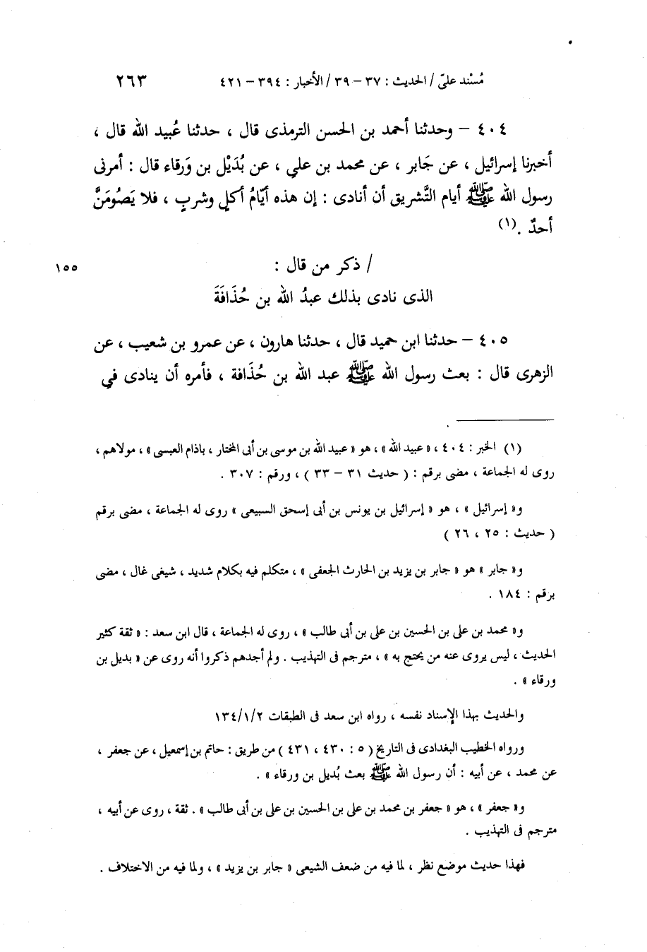 404 - وَحَدَّثَنَا أَحْمَدُ بْنُ الْحَسَنِ التِّرْمِذِيُّ، قَالَ: حَدَّثَنَا عُبَيْدُ اللَّهِ، قَالَ: أَخْبَرَنَا إِسْرَائِيلُ , عَنْ جَابِرٍ , عَنْ مُحَمَّدِ بْنِ عَلِيٍّ , ? عَنْ بُدَيْلِ بْنِ وَرْقَاءَ، قَالَ: أَمَرَنِي رَسُولُ اللَّهِ صَلَّى اللهُ عَلَيْهِ وَسَلَّمَ أَيَّامَ التَّشْرِيقِ أَنْ أُنَادِيَ: «إِنَّ §هَذِهِ أَيَّامُ أَكْلٍ وَشُرْبٍ، فَلَا يَصُومَنَّ أَحَدٌ»
