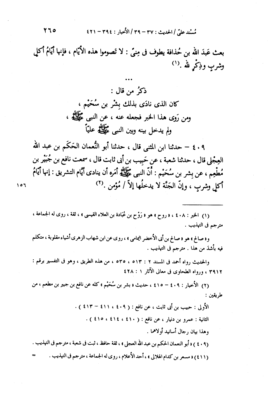 409 - حَدَّثَنَا ابْنُ الْمُثَنَّى، قَالَ: حَدَّثَنَا أَبُو النُّعْمَانِ الْحَكَمُ بْنُ عَبْدِ اللَّهِ الْعِجْلِيُّ، قَالَ: حَدَّثَنَا شُعْبَةُ , عَنْ حَبِيبِ بْنِ أَبِي ثَابِتٍ، قَالَ: سَمِعْتُ نَافِعَ بْنَ جُبَيْرِ بْنِ مُطْعِمٍ , عَنْ بِشْرِ بْنِ سُحَيْمٍ، أَنَّ النَّبِيَّ صَلَّى اللهُ عَلَيْهِ وَسَلَّمَ أَمَرَهُ أَنْ يُنَادِيَ أَيَّامَ التَّشْرِيقِ: «إِنَّهَا §أَيَّامُ أَكْلٍ وَشُرْبٍ، وَإِنَّ الْجَنَّةَ لَا يَدْخُلُهَا إِلَّا مُؤْمِنٌ»