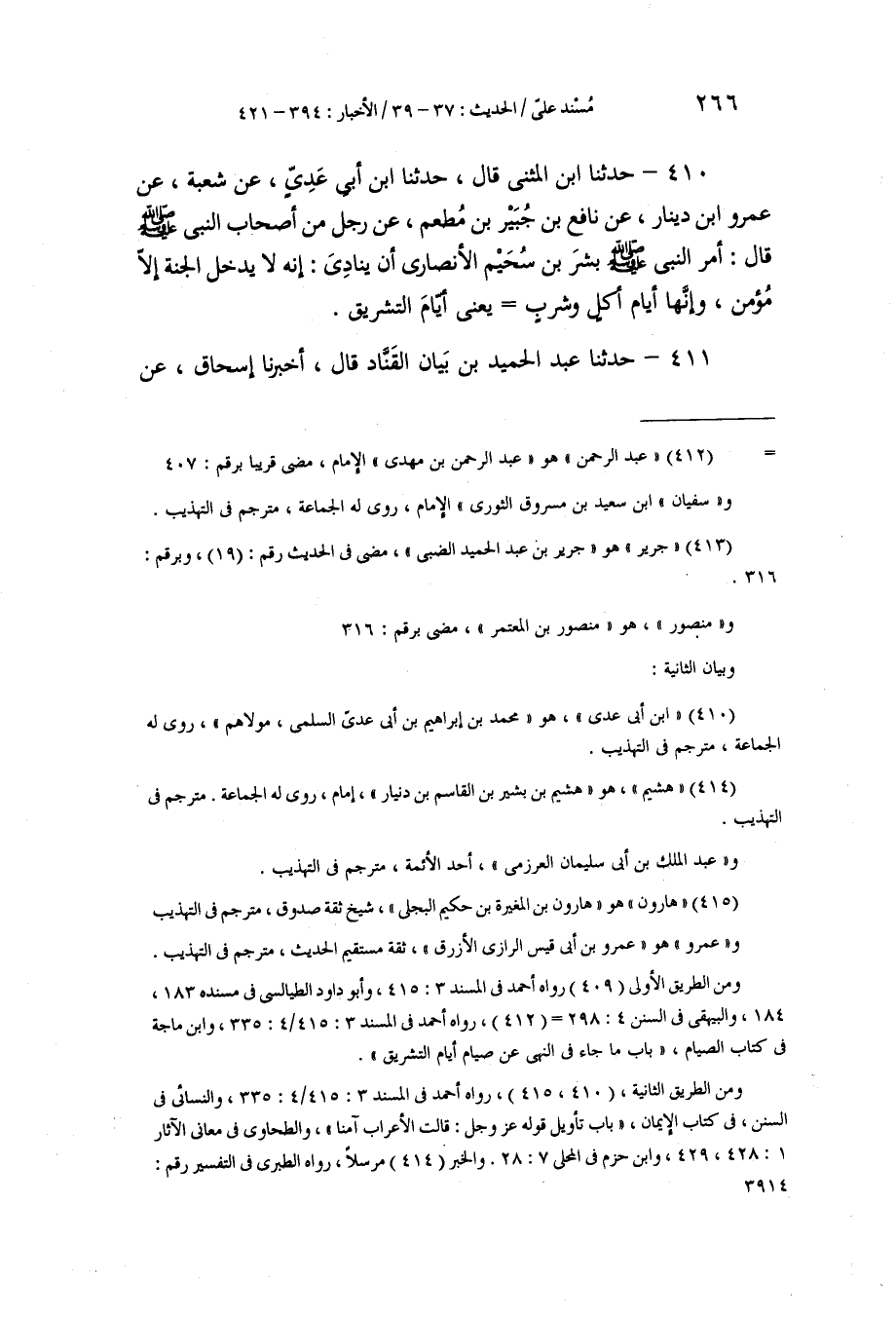 410 - حَدَّثَنَا ابْنُ الْمُثَنَّى، قَالَ: حَدَّثَنَا ابْنُ أَبِي عَدِيٍّ، عَنْ شُعْبَةَ، عَنْ عَمْرِو بْنِ دِينَارٍ , عَنْ نَافِعِ بْنِ جُبَيْرِ بْنِ مُطْعِمٍ , عَنْ رَجُلٍ، مِنْ أَصْحَابِ النَّبِيِّ صَلَّى اللهُ عَلَيْهِ وَسَلَّمَ قَالَ: أَمَرَ النَّبِيُّ صَلَّى اللهُ عَلَيْهِ وَسَلَّمَ بِشْرَ بْنَ سُحَيْمٍ الْأَنْصَارِيَّ أَنْ يُنَادِيَ: «§إِنَّهُ لَا يَدْخُلُ الْجَنَّةَ إِلَّا مُؤْمِنٌ، وَإِنَّهَا أَيَّامُ أَكْلٍ وَشُرْبٍ» ، يَعْنِي أَيَّامَ التَّشْرِيقِ.
