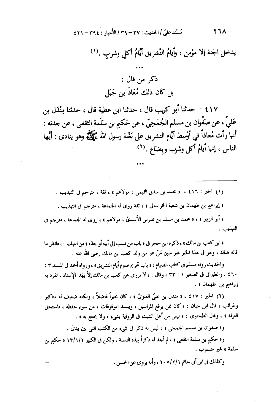 417 - حَدَّثَنَا أَبُو كُرَيْبٍ، قَالَ: حَدَّثَنَا ابْنُ عَطِيَّةَ، قَالَ: حَدَّثَنَا مِنْدَلُ بْنُ عَلِيٍّ , عَنْ صَفْوَانَ بْنِ مُسْلِمٍ الْجُمَحِيِّ , عَنْ حَكِيمِ بْنِ سَلَمَةَ الثَّقَفِيِّ , عَنْ جَدَّتِهِ، أَنَّهَا رَأَتْ مُعَاذًا فِي أَوْسَطِ أَيَّامِ التَّشْرِيقِ عَلَى بَغْلَةِ رَسُولِ اللَّهِ صَلَّى اللهُ عَلَيْهِ وَسَلَّمَ وَهُوَ يُنَادِي: «أَيُّهَا النَّاسُ، §إِنَّهَا أَيَّامُ أَكْلٍ وَشُرْبٍ وَبِضَاعٍ»