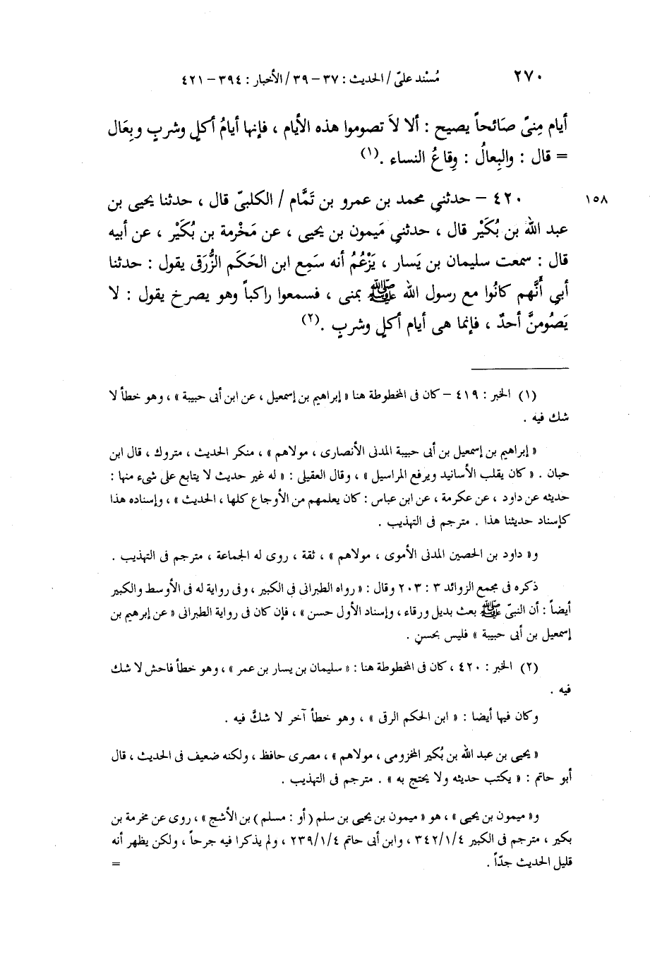 420 - حَدَّثَنِي مُحَمَّدُ بْنُ عَمْرِو بْنِ تَمَّامٍ الْكَلْبِيُّ، قَالَ: حَدَّثَنَا يَحْيَى بْنُ عَبْدِ اللَّهِ بْنِ بُكَيْرٍ، قَالَ: حَدَّثَنِي مَيْمُونُ بْنُ يَحْيَى , عَنْ مَخْرَمَةَ بْنِ بُكَيْرٍ , عَنْ أَبِيهِ، قَالَ: سَمِعْتُ سُلَيْمَانَ بْنَ يَسَارٍ , يَزْعُمُ أَنَّهُ سَمِعَ ابْنَ الْحَكَمِ الزُّرَقِيَّ، يَقُولُ: حَدَّثَنَا أَبِي أَنَّهُمْ، كَانُوا مَعَ رَسُولِ اللَّهِ صَلَّى اللهُ عَلَيْهِ وَسَلَّمَ بِمِنًى، فَسَمِعُوا رَاكِبًا وَهُوَ يَصْرُخُ يَقُولُ: «§لَا يَصُومَنَّ أَحَدٌ، فَإِنَّمَا هِيَ أَيَّامُ أَكْلٍ وَشُرْبٍ»