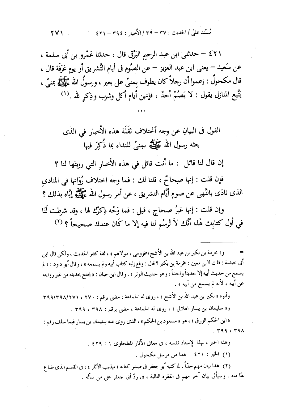 §الْقَوْلُ فِي الْبَيَانِ عَنْ وَجْهِ اخْتِلَافِ نَقَلَةِ هَذِهِ الْأَخْبَارِ فِي الَّذِي بَعَثَهُ رَسُولُ اللَّهِ صَلَّى اللهُ عَلَيْهِ وَسَلَّمَ بِمِنًى لِلنِّدَاءِ بِمَا ذُكِرَ فِيهَا إِنْ قَالَ لَنَا قَائِلٌ: مَا أَنْتَ قَائِلٌ فِي هَذِهِ الْأَخْبَارِ الَّتِي رَوَيْتَهَا لَنَا؟ فَإِنْ قُلْتَ: إِنَّهَا صِحَاحٌ، قُلْنَا لَكَ: فَمَا وَجْهُ اخْتِلَافِ رُوَاتِهَا فِي الْمُنَادِي الَّذِي نَادَى بِالنَّهْيِ عَنْ صَوْمِ أَيَّامِ التَّشْرِيقِ، عَنْ أَمْرِ رَسُولِ اللَّهِ صَلَّى اللهُ عَلَيْهِ وَسَلَّمَ إِيَّاهُ بِذَلِكَ؟ وَإِنْ قُلْتَ: إِنَّهَا غَيْرُ صِحَاحٍ، قِيلَ: فَمَا وَجْهُ ذِكْرِكَ لَهَا، وَقَدْ شَرَطْتَ لَنَا فِي أَوَّلِ كِتَابِكَ هَذَا أَنَّكَ لَا تَرْسُمُ لَنَا فِيهِ إِلَّا مَا كَانَ عِنْدَكَ صَحِيحًا؟