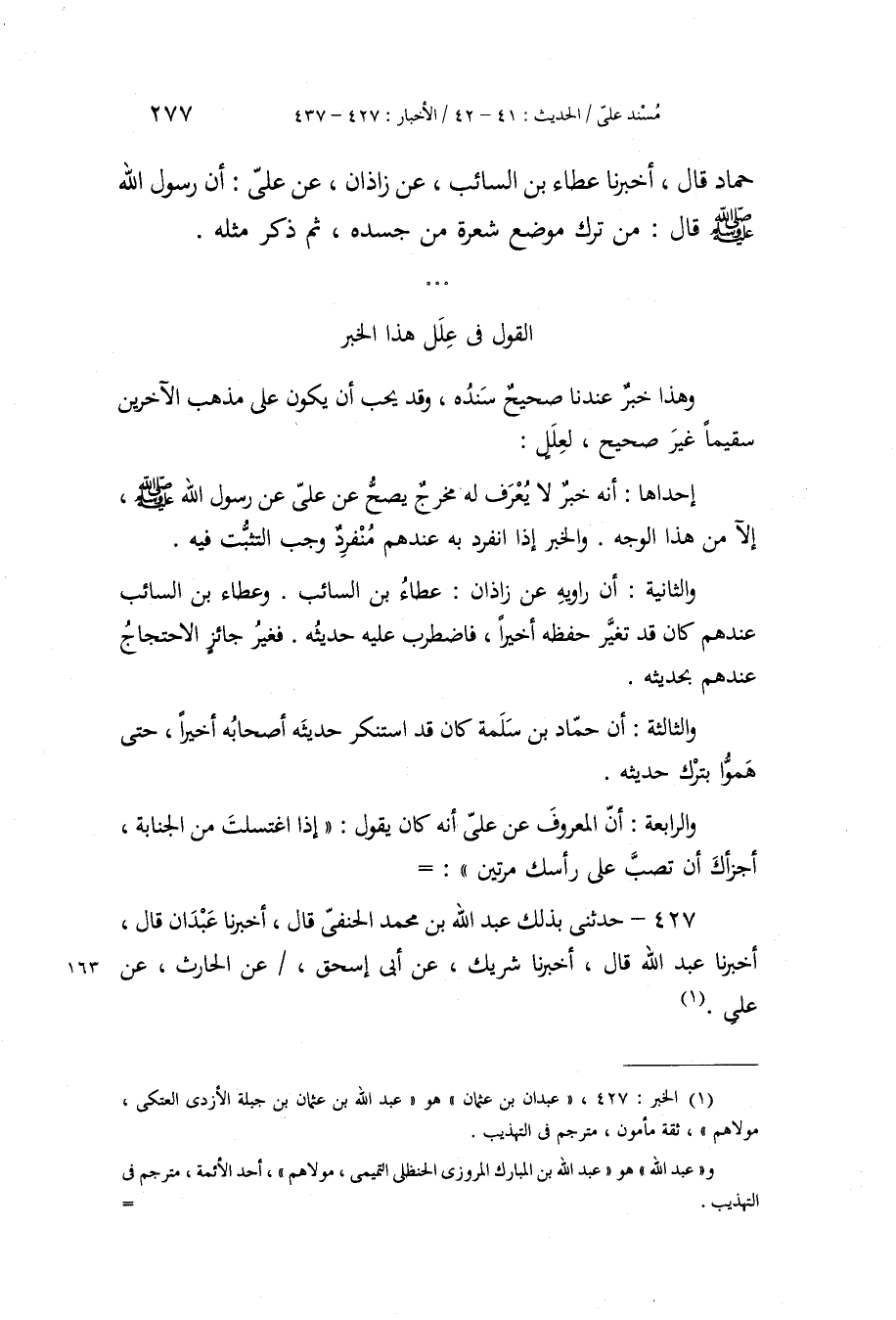 §الْقَوْلُ فِي عِلَلِ هَذَا الْخَبَرِ وَهَذَا خَبَرٌ عِنْدَنَا صَحِيحٌ سَنَدُهُ، وَقَدْ يَجِبُ أَنْ يَكُونَ عَلَى مَذْهَبِ الْآخَرِينَ سَقِيمًا غَيْرَ صَحِيحٍ، لِعِلَلٍ: إِحْدَاهَا: أَنَّهُ خَبَرٌ لَا يُعْرَفُ لَهُ مَخْرَجٌ يَصِحُّ عَنْ عَلِيٍّ , عَنْ رَسُولِ اللَّهِ صَلَّى اللهُ عَلَيْهِ وَسَلَّمَ، إِلَّا مِنْ هَذَا الْوَجْهِ. وَالْخَبَرُ إِذَا انْفَرَدَ بِهِ عِنْدَهُمْ مُنْفَرِدٌ وَجَبَ التَّثَبُّتُ فِيهِ. وَالثَّانِيَةُ: أَنَّ رَاوِيهِ عَنْ زَاذَانَ: عَطَاءُ بْنُ السَّائِبِ، وَعَطَاءُ بْنُ السَّائِبِ عِنْدَهُمْ كَانَ قَدْ تَغَيَّرَ حِفْظُهُ أَخِيرًا، فَاضْطَرَبَ عَلَيْهِ حَدِيثُهُ. فَغَيْرُ جَائِزٍ الِاحْتِجَاجُ عِنْدَهُمْ بِحَدِيثِهِ. وَالثَّالِثَةُ: أَنَّ حَمَّادَ بْنَ سَلَمَةَ كَانَ قَدِ اسْتَنْكَرَ حَدِيثَهُ أَصْحَابُهُ أَخِيرًا، حَتَّى هَمُّوا بِتَرْكِ حَدِيثِهِ. وَالرَّابِعَةُ: أَنَّ الْمَعْرُوفَ عَنْ عَلِيٍّ أَنَّهُ كَانَ يَقُولُ: إِذَا اغْتَسَلْتَ مِنَ الْجَنَابَةِ، أَجْزَأَكَ أَنْ تَصُبَّ عَلَى رَأْسِكَ مَرَّتَيْنِ