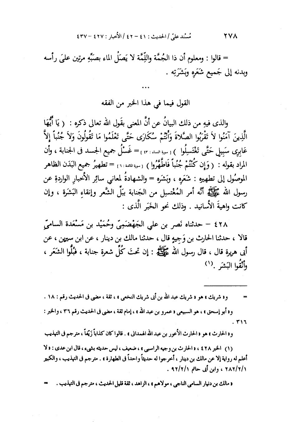 428 - حَدَّثَنَاهُ نَصْرُ بْنُ عَلِيٍّ الْجَهْضَمِيُّ , وَحُمَيْدُ بْنُ مَسْعَدَةَ السَّامِيُّ، قَالَا: حَدَّثَنَا الْحَارِثُ بْنُ وَجِيهٍ، قَالَ: حَدَّثَنَا مَالِكُ بْنُ دِينَارٍ , عَنِ ابْنِ سِيرِينَ , عَنْ أَبِي هُرَيْرَةَ، قَالَ: قَالَ رَسُولُ اللَّهِ صَلَّى اللهُ عَلَيْهِ وَسَلَّمَ: «§إِنَّ تَحْتَ كُلِّ شَعْرَةٍ جَنَابَةً، فَبُلُّوا الشَّعْرَ , وَأَنْقُوا الْبَشَرَ»