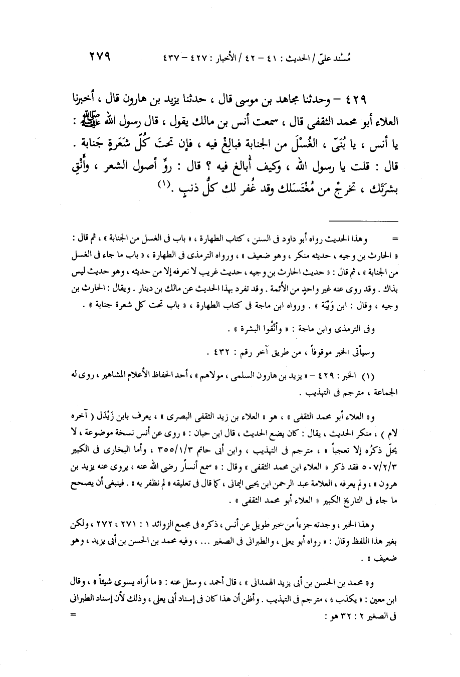 429 - وَحَدَّثَنَا مُجَاهِدُ بْنُ مُوسَى، قَالَ: حَدَّثَنَا يَزِيدُ بْنُ هَارُونَ، قَالَ: أَخْبَرَنَا الْعَلَاءُ أَبُو مُحَمَّدٍ الثَّقَفِيُّ، قَالَ: سَمِعْتُ أَنَسَ بْنَ مَالِكٍ، يَقُولُ: قَالَ رَسُولُ اللَّهِ صَلَّى اللهُ عَلَيْهِ وَسَلَّمَ: «يَا أَنَسُ، يَا بُنَيَّ، الْغُسْلَ مِنَ الْجَنَابَةِ فَبَالِغْ فِيهِ، فَإِنَّ تَحْتَ كُلِّ شَعْرَةٍ جَنَابَةً» , قَالَ: قُلْتُ: يَا رَسُولَ اللَّهِ، وَكَيْفَ أُبَالِغُ فِيهِ؟ قَالَ: §رَوِّ أُصُولَ الشَّعْرِ، وَأَنْقِ بَشَرَتَكَ، تَخْرُجْ مِنْ مُغْتَسَلِكَ وَقَدْ غُفِرَ لَكَ كُلُّ ذَنْبٍ "