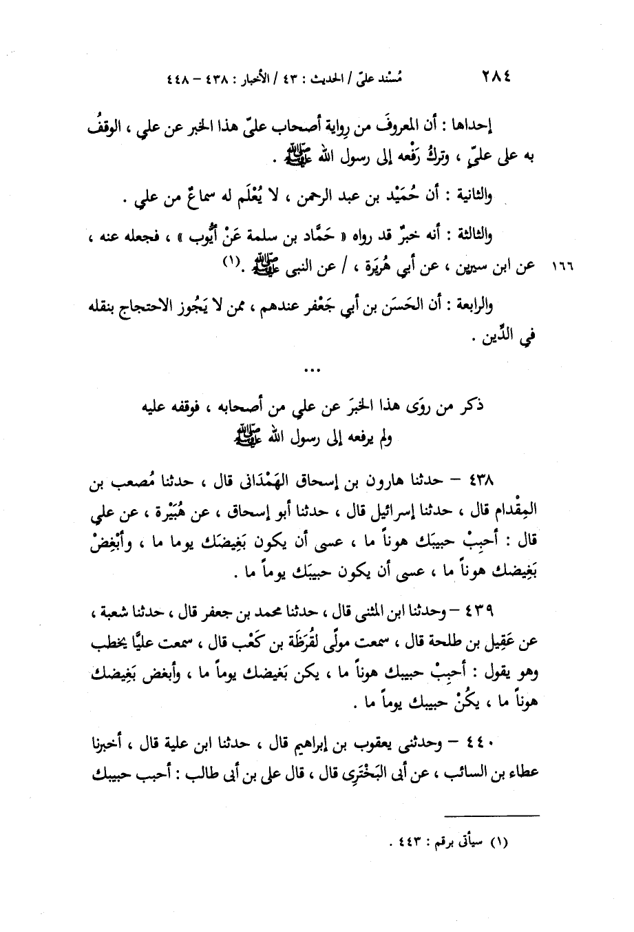 438 - حَدَّثَنَا هَارُونُ بْنُ إِسْحَاقَ الْهَمْدَانِيُّ، قَالَ: حَدَّثَنَا مُصْعَبُ بْنُ الْمِقْدَامِ، قَالَ: حَدَّثَنَا إِسْرَائِيلُ، قَالَ: حَدَّثَنَا أَبُو إِسْحَاقَ , عَنْ هُبَيْرَةَ عَنْ عَلِيٍّ، قَالَ: §أَحْبِبْ حَبِيبَكَ هَوْنًا مَا، عَسَى أَنْ يَكُونَ بَغِيضَكَ يَوْمًا مَا، وَأَبْغِضْ بَغِيضَكَ هَوْنًا مَا، عَسَى أَنْ يَكُونَ حَبِيبَكَ يَوْمًا مَا