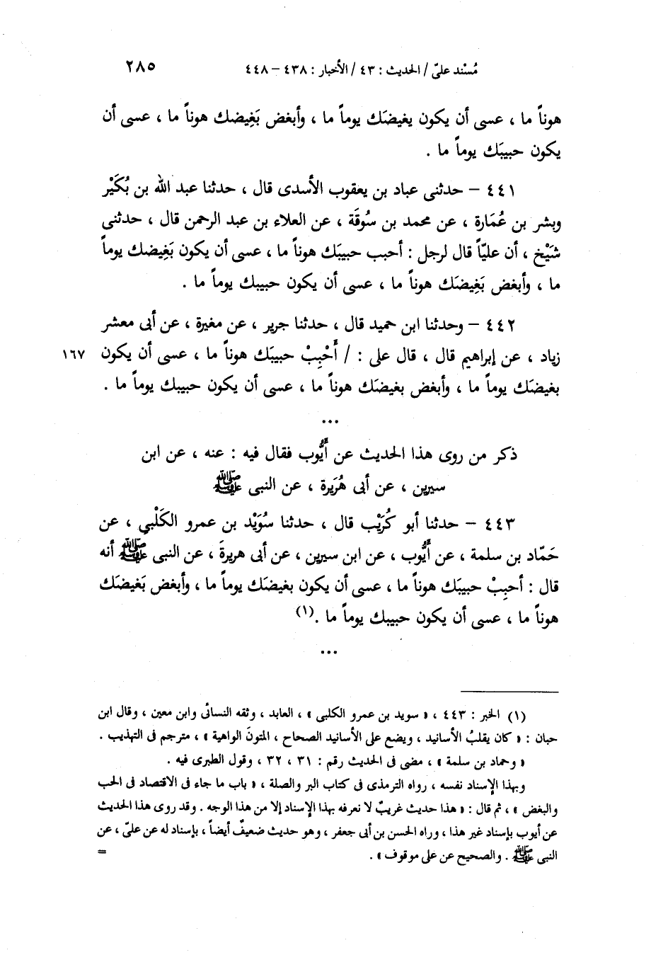 443 - حَدَّثَنَا أَبُو كُرَيْبٍ، قَالَ: حَدَّثَنَا سُوَيْدُ بْنُ عَمْرٍو الْكَلْبِيُّ , عَنْ حَمَّادِ بْنِ سَلَمَةَ , عَنْ أَيُّوبَ , عَنِ ابْنِ سِيرِينَ , عَنْ أَبِي هُرَيْرَةَ , عَنِ النَّبِيِّ صَلَّى اللهُ عَلَيْهِ وَسَلَّمَ أَنَّهُ قَالَ: «§أَحْبِبْ حَبِيبَكَ هَوْنًا مَا، عَسَى أَنْ يَكُونَ بَغِيضَكَ يَوْمًا مَا، وَأَبْغِضْ بَغِيضَكَ هَوْنًا مَا، عَسَى أَنْ يَكُونَ حَبِيبَكَ يَوْمًا مَا» -[286]- وَقَدْ وَافَقَ عَلِيًّا رَحْمَةُ اللَّهِ عَلَيْهِ جَمَاعَةٌ مِنَ السَّلَفِ فِي مَعْنَى هَذَا الْخَبَرِ، نَذْكُرُ مَنْ حَضَرَنَا ذِكْرُهُ مِنْهُمْ