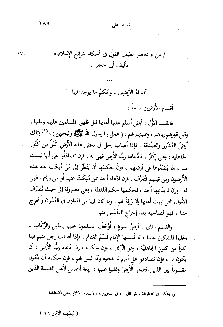 فالقسم الأول أَرض أسلم عَلَيْهَا أَهلهَا قبل ظُهُور الْمُسلمين عَلَيْهِم وَعَلَيْهَا وَقبل قهرهم إيَّاهُم وغلبتهم لَهُم عمل بهَا رَسُول الله صلى الله عَلَيْهِ وَسلم والبحرين وَتلك أَرض العشور وَالصَّدَََقَة فَإِذا أصَاب رجل فِي بعض هَذِه الأَرْض كنزا من كنوز الْجَاهِلِيَّة وَهِي ركاز فادعاها رب الأَرْض فَهِيَ لَهُ فَإِن تصادقوا على أَنَّهَا لَيست لَهُم وَلم يضعوها فِي أَرضهم فَإِن حكمهَا أَن ينظر إِلَى من ملكت عَنهُ هَذِه الأرضون وَمن قبلهم فتعرف فَإِن ادَّعَاهُ أحد مِمَّن ملكت عَنْهُم أَو من ورثتهم فَهِيَ لَهُ وَإِن لم يَدعهَا أحد فَحكمهَا حكم اللّقطَة وَهِي مصروفة إِلَى حَيْثُ تصرف الْأَمْوَال الَّتِي يَمُوت أَهلهَا وَلَا وَرَثَة لَهُم وَمَا كَانَ فِيهَا من الْمَعَادِن فِي الْعمرَان وَأخرج مِنْهَا فَهُوَ لصَاحبه بعد إِخْرَاج الْخمس مِنْهَا