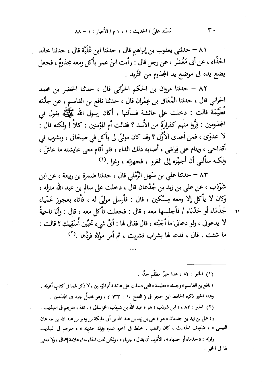82 - حَدَّثَنَا مَرْوَانُ بْنُ الْحَكَمِ الْحَرَّانِيُّ، قَالَ: حَدَّثَنَا الْخَضِرُ بْنُ مُحَمَّدٍ الْحَرَّانِيُّ، قَالَ: حَدَّثَنَا الْمُعَافَى بْنُ عِمْرَانَ، قَالَ: حَدَّثَنَا نَافِعُ بْنُ الْقَاسِمِ، عَنْ جَدَّتِهِ فُطَيْمَةَ قَالَتْ: دَخَلْتُ عَلَى عَائِشَةَ فَسَأَلْتُهَا: أَكَانَ رَسُولُ اللَّهِ صَلَّى اللهُ عَلَيْهِ وَسَلَّمَ يَقُولُ فِي الْمَجْذُومِينَ: «فِرُّوا مِنْهُمْ كَفِرَارِكُمْ مِنَ الْأَسَدِ» ؟ فَقَالَتْ أُمُّ الْمُؤْمِنِينَ: كَلَّا وَلَكِنَّهُ قَالَ: «§لَا عَدْوَى، فَمَنْ أَعْدَى الْأَوَّلَ؟» وَقَدْ كَانَ مَوْلًى لِي يَأْكُلُ فِي صِحَافِي، وَيَشْرَبُ فِي أَقْدَاحِي، وَيَنَامُ عَلَى فِرَاشِي، أَصَابَهُ ذَلِكَ الدَّاءُ، فَلَوْ أَقَامَ مَعِي عَايَشْتُهُ مَا عَاشَ، وَلَكِنَّهُ سَأَلَنِي أَنْ أُجَهِّزَهُ إِلَى الْغَزْوِ، فَجَهَّزْتُهُ، وَغَزَا
