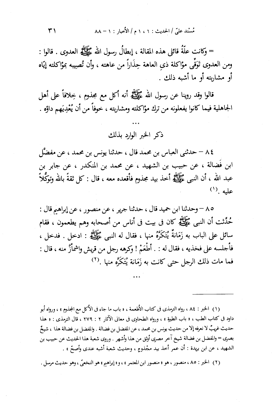 84 - حَدَّثَنِي الْعَبَّاسُ بْنُ مُحَمَّدٍ، قَالَ: حَدَّثَنَا يُونُسُ بْنُ مُحَمَّدٍ، عَنْ مُفَضَّلِ بْنِ فَضَالَةَ، عَنْ حَبِيبِ بْنِ الشَّهِيدِ، عَنْ مُحَمَّدِ بْنِ الْمُنْكَدِرِ، عَنْ جَابِرِ بْنِ عَبْدِ اللَّهِ، أَنَّ النَّبِيَّ صَلَّى اللهُ عَلَيْهِ وَسَلَّمَ أَخَذَ بِيَدِ مَجْذُومٍ فَأَقْعَدَهُ مَعَهُ، قَالَ: «§كُلْ ثِقَةً بِاللَّهِ وَتَوَكُّلًا عَلَيْهِ»