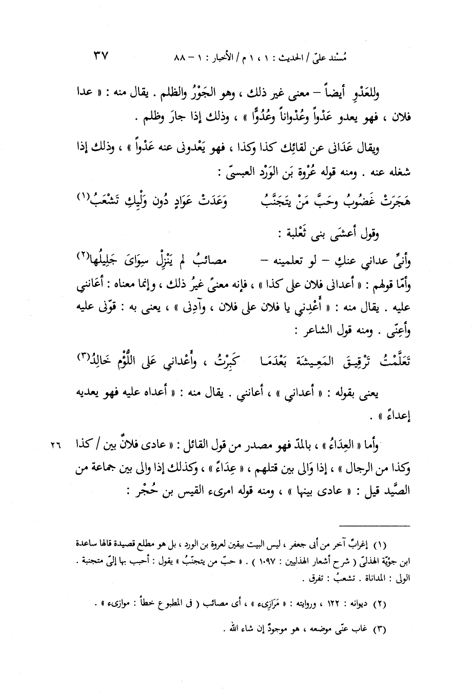 ، وَلِلْعَدْوِ أَيْضًا مَعْنًى غَيْرُ ذَلِكَ، وَهُوَ الْجَوْرُ وَالظُّلْمُ، يُقَالُ مِنْهُ: عَدَا فُلَانٌ، فَهُوَ يَعْدُو عَدْوًا وَعُدْوَانًا وَعُدُوًّا، وَذَلِكَ إِذَا جَارَ وَظَلَمَ، وَيُقَالُ: عَدَانِي عَنْ لِقَائِكَ كَذَا وَكَذَا، فَهُوَ يَعْدُونِي عَنْهُ عَدْوًا، وَذَلِكَ إِذَا شَغَلَهُ عَنْهُ، وَمِنْهُ قَوْلُهُ عُرْوَةُ بْنُ الْوَرْدِ الْعَبْسِيُّ: