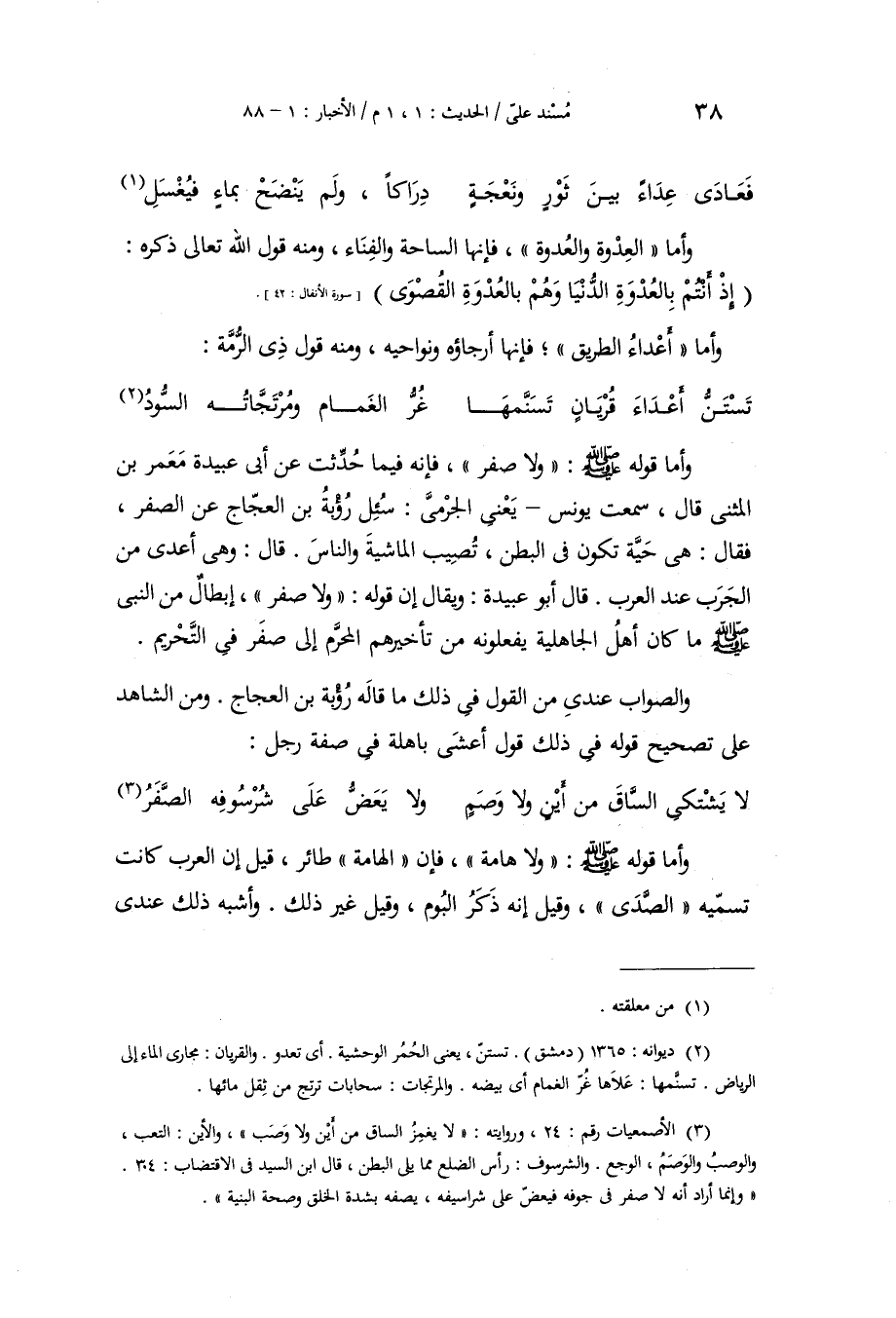 وَأَمَّا قَوْلُهُ صَلَّى اللهُ عَلَيْهِ وَسَلَّمَ «وَلَا صَفَرَ» ، فَإِنَّهُ فِيمَا حُدِّثْتُ عَنْ أَبِي عُبَيْدَةَ مَعْمَرِ بْنِ الْمُثَنَّى قَالَ: سَمِعْتُ يُونُسَ يَعْنِي الْجَرْمِيَّ: سُئِلَ رُؤْبَةُ بْنُ الْعَجَّاجِ عَنِ الصَّفَرِ، فَقَالَ: «هِيَ حَيَّةٌ تَكُونُ فِي الْبَطْنِ، تُصِيبُ الْمَاشِيَةَ وَالنَّاسَ» قَالَ: وَهِيَ أَعْدَى مِنَ الْجَرَبِ عِنْدَ الْعَرَبِ قَالَ أَبُو عُبَيْدَةَ: وَيُقَالُ: إِنَّ قَوْلَهُ: «وَلَا صَفَرَ» ، إِبْطَالٌ مِنَ النَّبِيِّ صَلَّى اللهُ عَلَيْهِ وَسَلَّمَ مَا كَانَ أَهْلُ الْجَاهِلِيَّةِ، يَفْعَلُونَهُ مِنْ تَأْخِيرِهِمُ الْمُحَرَّمَ إِلَى صَفَرَ فِي التَّحْرِيمِ وَالصَّوَابُ عِنْدِي مِنَ الْقَوْلِ فِي ذَلِكَ مَا قَالَهُ رُؤْبَةُ بْنُ الْعَجَّاجِ، وَمِنَ الشَّاهِدِ عَلَى تَصْحِيحِ قَوْلِهِ فِي ذَلِكَ قَوْلُ أَعْشَى بَاهِلَةَ فِي صِفَةِ رَجُلٍ: